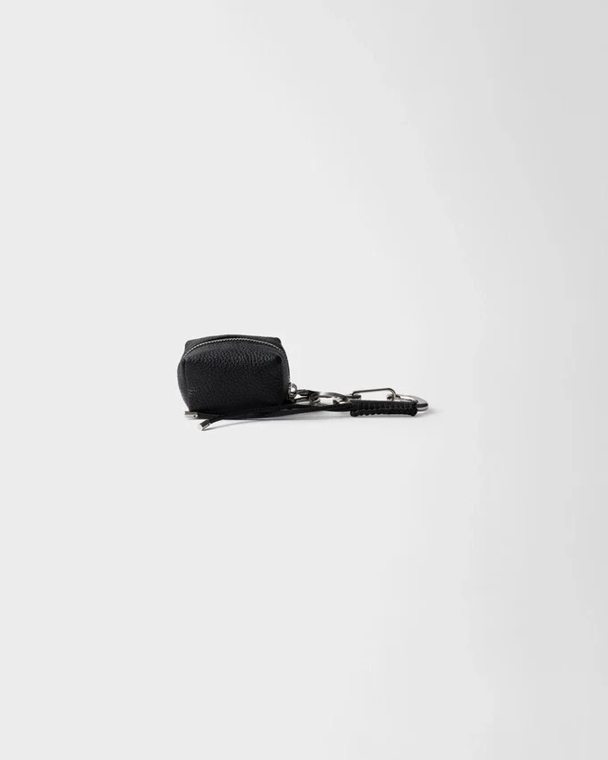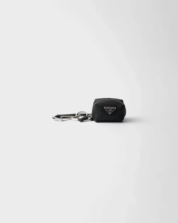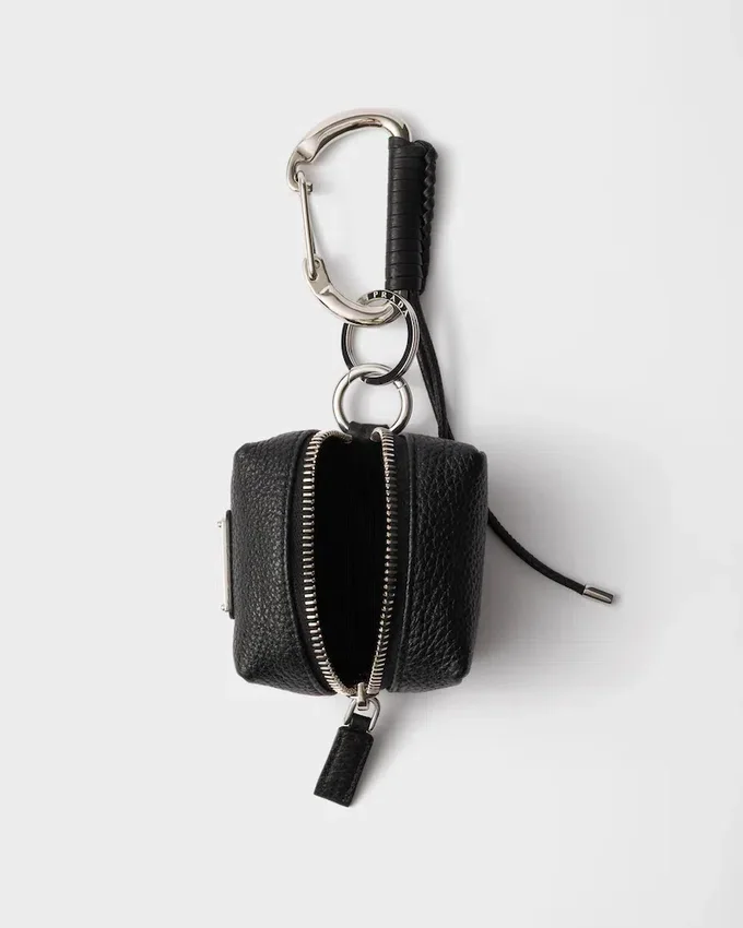 This Bag Charm Made of Leather Has a Multifunctional Design with Urban Style. The Iconic Enameled Metal Triangle Logo Adds Its Refined and Sophisticated Signature Touch to the Accessory.