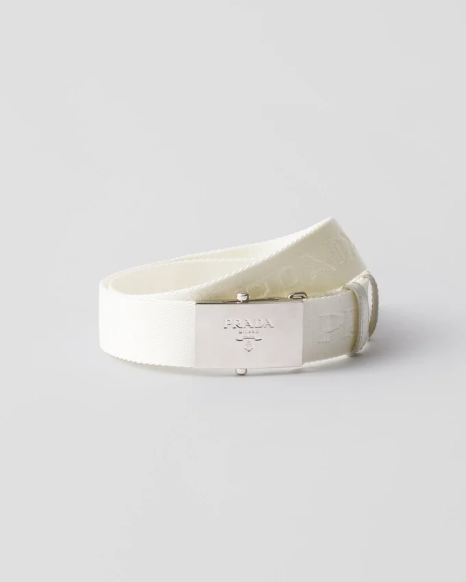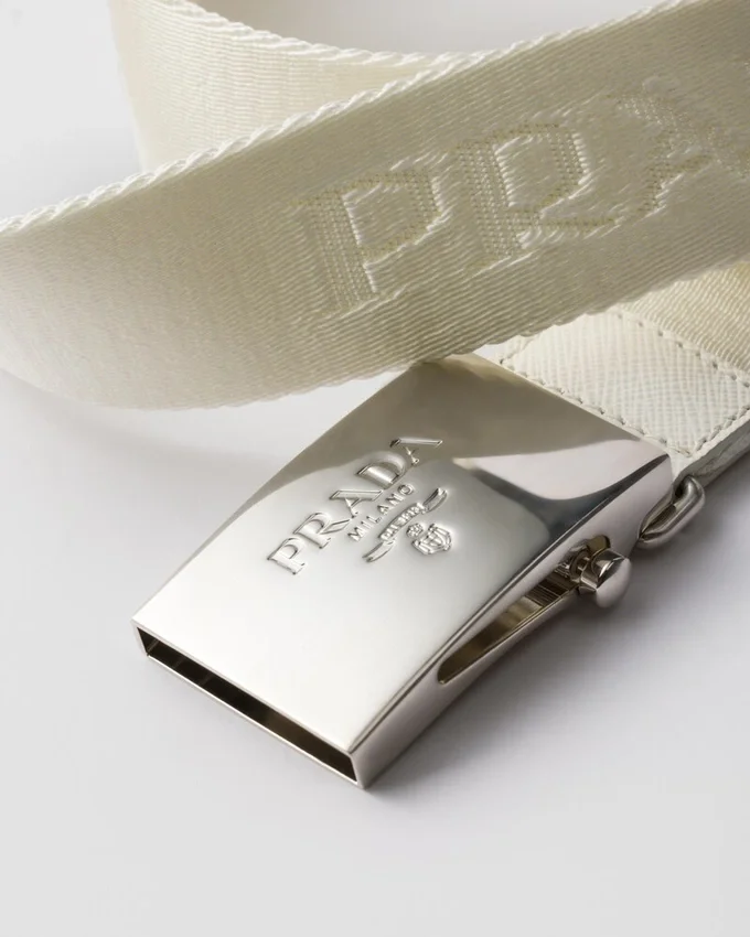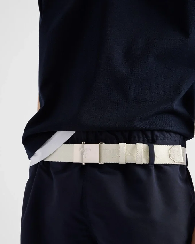 This Cotton Tape Belt with Versatile, Sporty Style Features Saffiano Leather Details and is Characterized by a Plaque Buckle Decorated with the Lettering Logo.