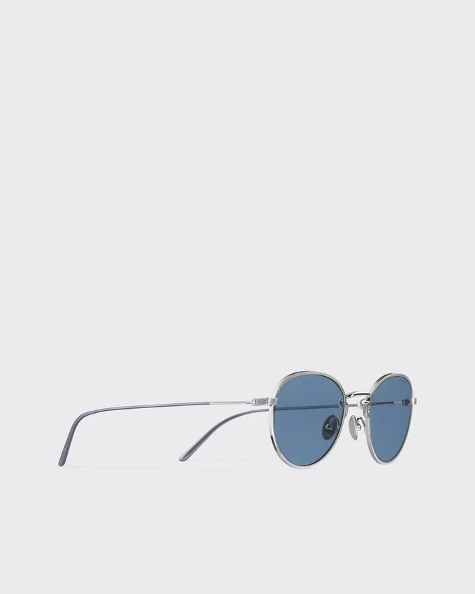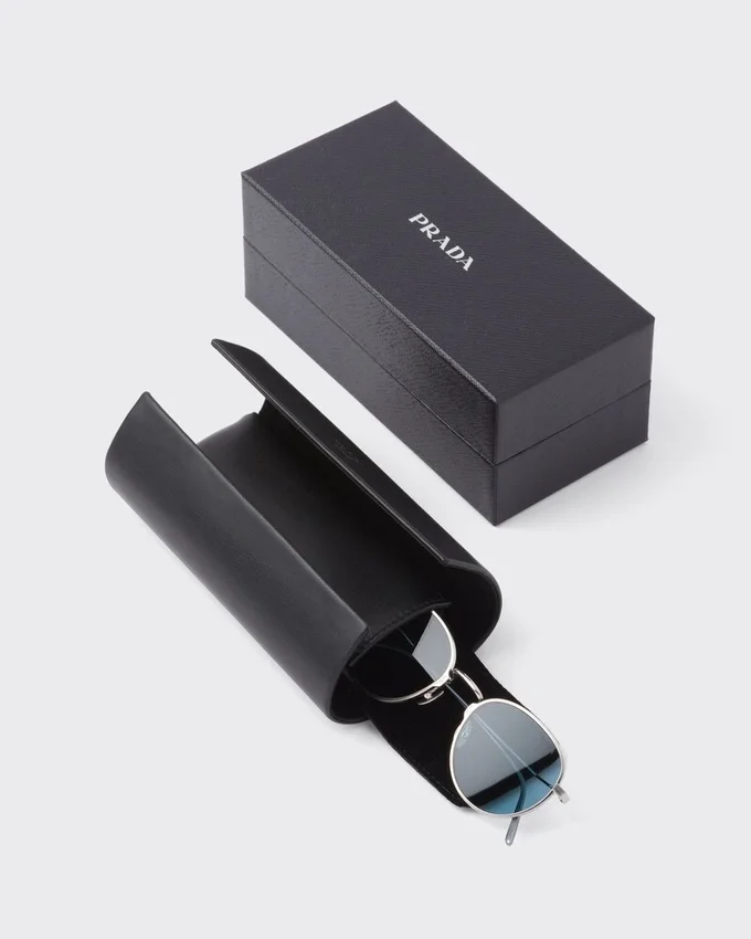 Titanium Sunglasses Specially Made in Japan. The Exclusive Ultra-Light Construction with a Pantos Shape is Characterized by Sleek, Minimalist Lines. The Slender Temples Are Decorated with the Prada Logo Delicately Engraved on the Tip.