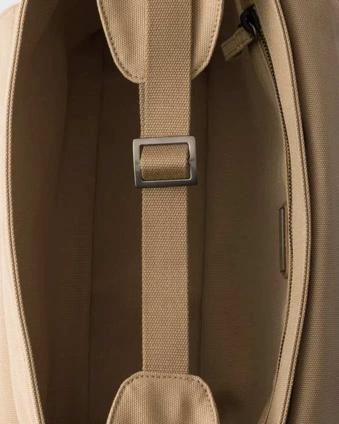 The Pragmatic Simplicity of Utility Wear Inspires This Canvas Bag. A Sleek Volume, Equipped with Both a Handle and a Shoulder Strap for Multiple Carrying Options, and a Spacious Interior with Pockets Designed to Hold All the Essentials, from Work to Leisure. The Minimalist Form Creates a Versatile, Contemporary Accessory That Interprets Functionality as an Authentic Expression of Style.