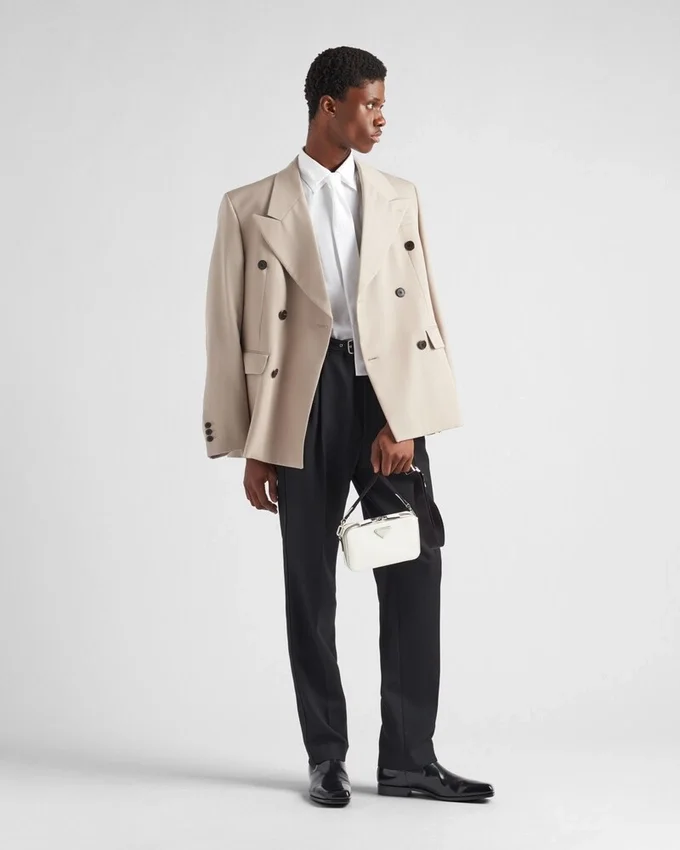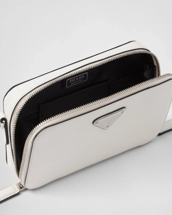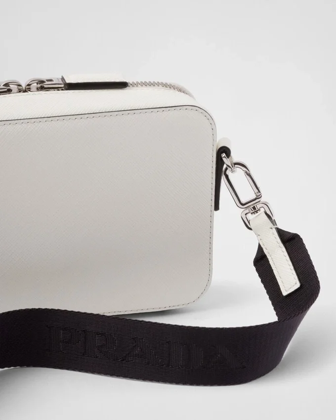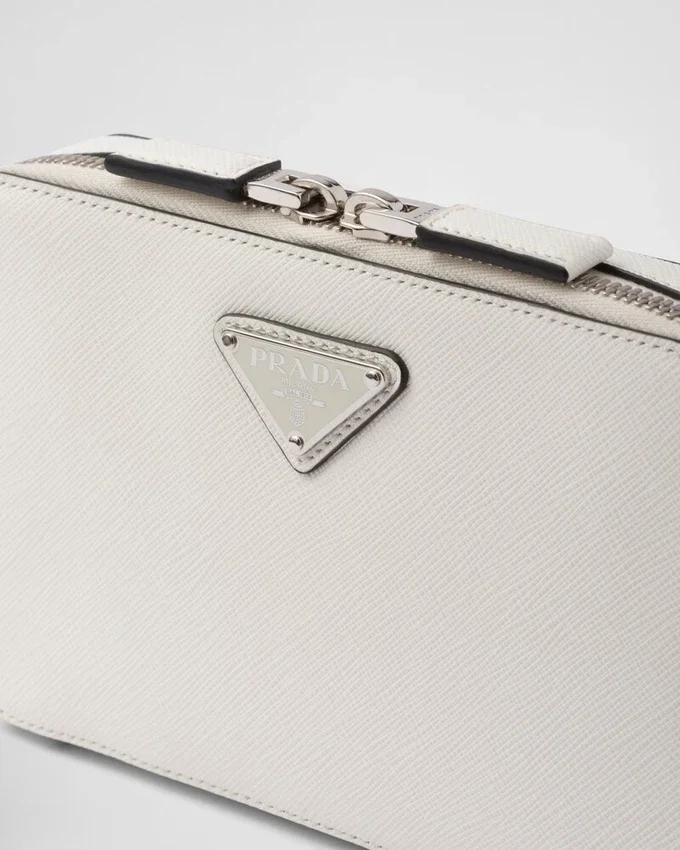 The Sleek Silhouette of the Prada Brique Bag is Enhanced by the Distinctive Crosshatch Texture of Saffiano Leather with a Waxed Finish. The Modern, Versatile Accessory with Detachable, Adjustable Shoulder Strap is Decorated with the Enameled Metal Triangle Logo.