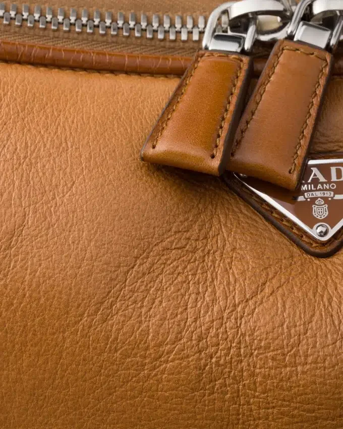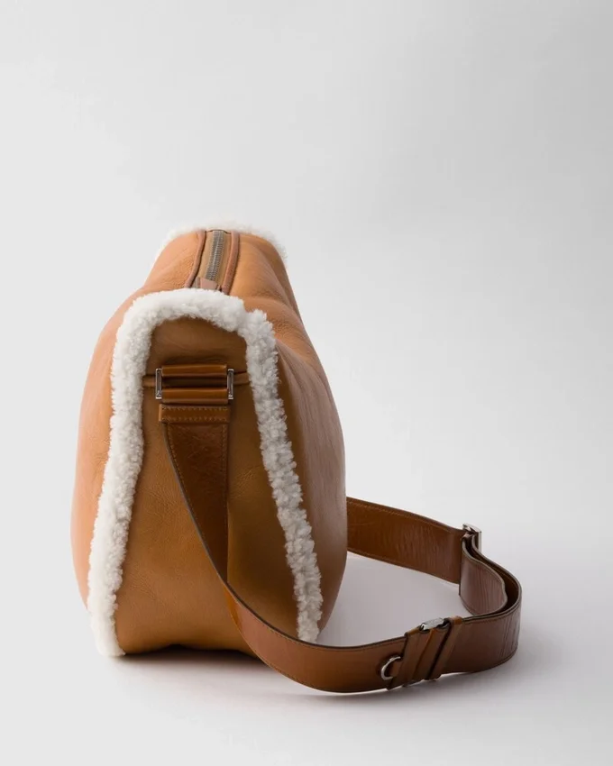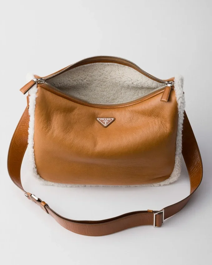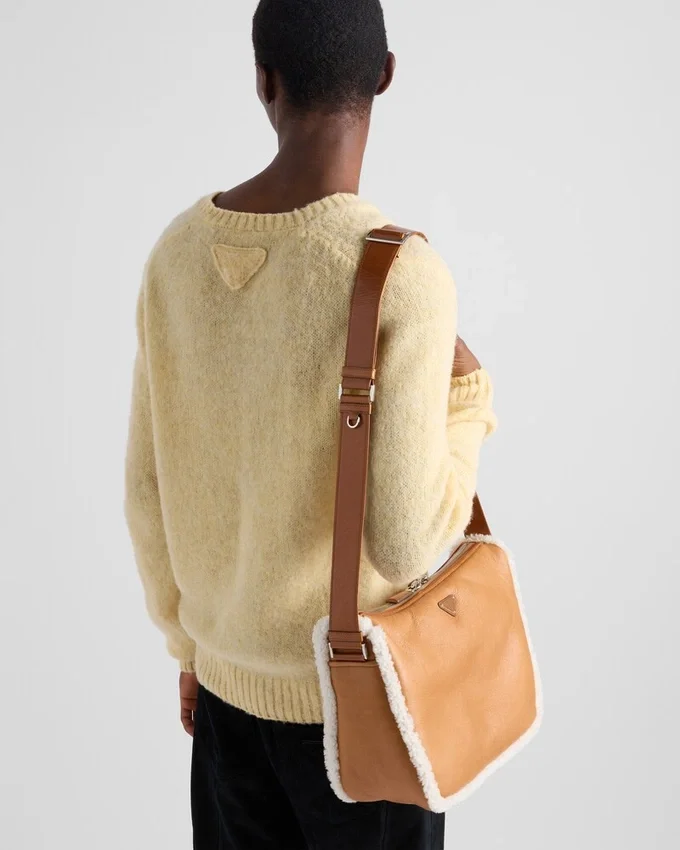 This Leather Bag with a Versatile, Roomy Design is Enriched by the Soft Texture of Shearling That Emphasizes the Sleek Shape of the Style. The Enameled Metal Triangle Logo Completes the Accessory with a Distinctive Touch.