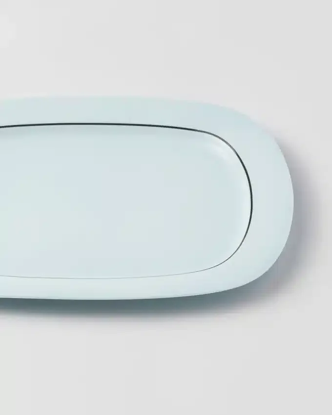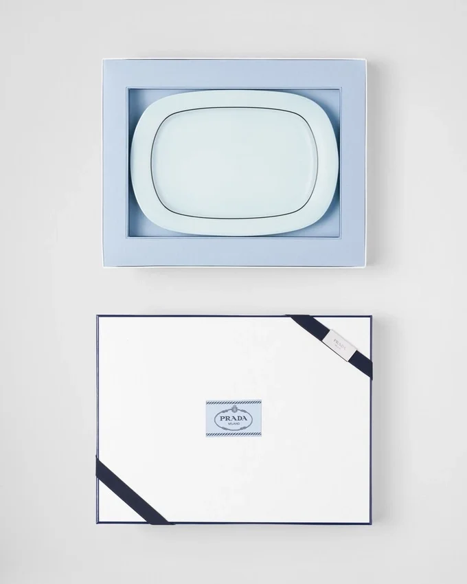This Rectangular Tray Made of Very Fine Glazed Porcelain Combines Artisan Skill and Prada’s Aesthetic Codes in a Refined, Modern Design. The Item, Inspired by Ancient Japanese Celadon Pottery, Comes in an Iconic, Delicate Nuance Enriched by a Precious Hand-Painted Edge.