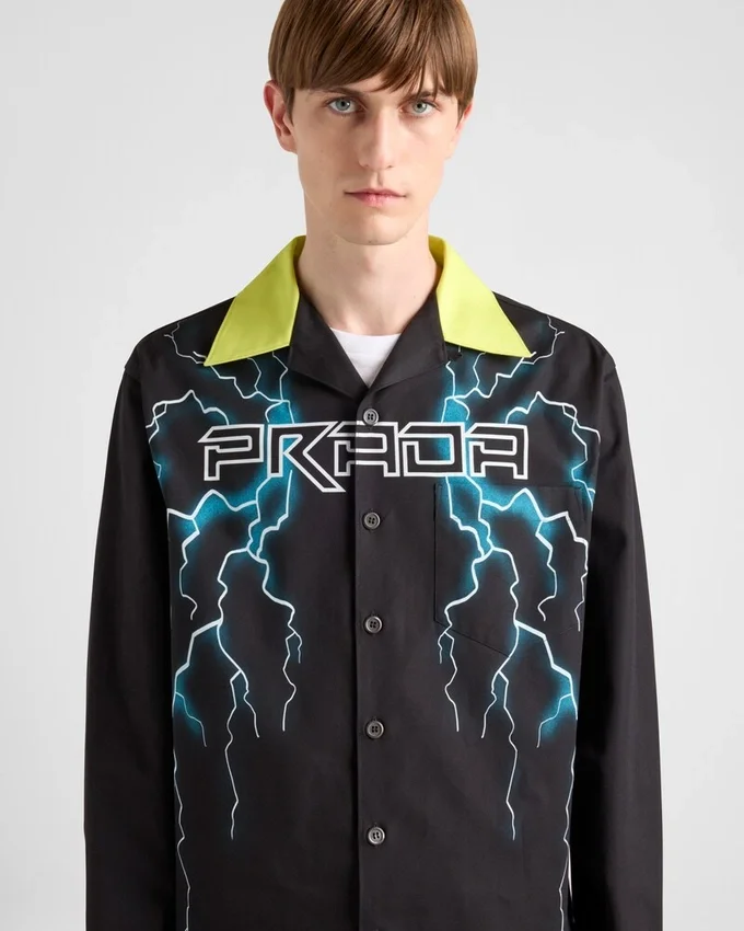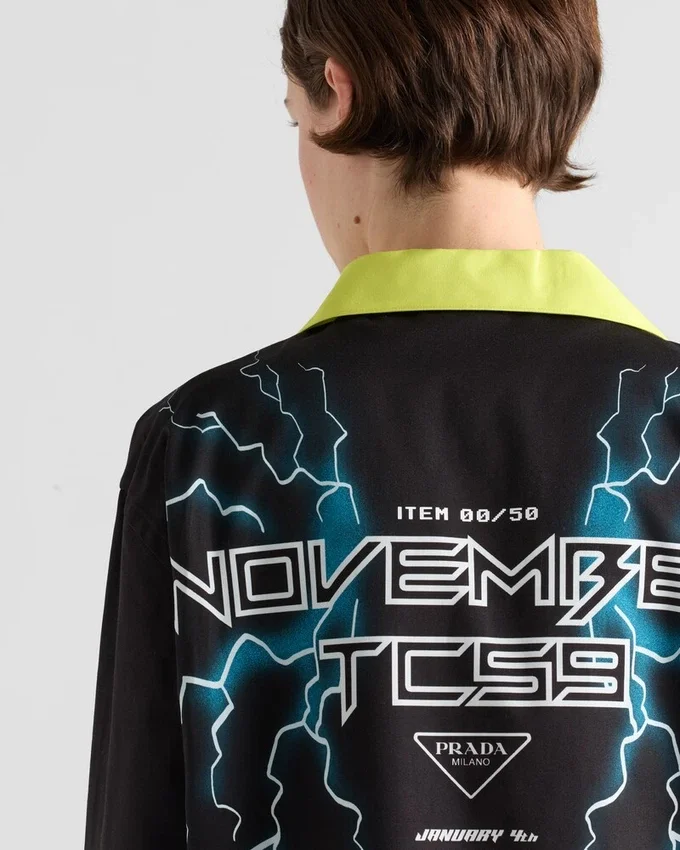 For the Timecapsule Drop #59, Prada Presents the Second of a Series of Three Limited Edition Shirts Characterized by Striking Graphic Art. The Exclusive Print Combines the Electric Vibe and Symbolism of Heavy Metal Music with a Retro-Style Silhouette Defined by the Bowling Collar. Available Exclusively Online for Just 24 Hours, the Drop Includes the Timecapsule Shirt and Its Nft Digital Version That Lets You Become Part of Prada’s Exclusive Crypted Nft Community.