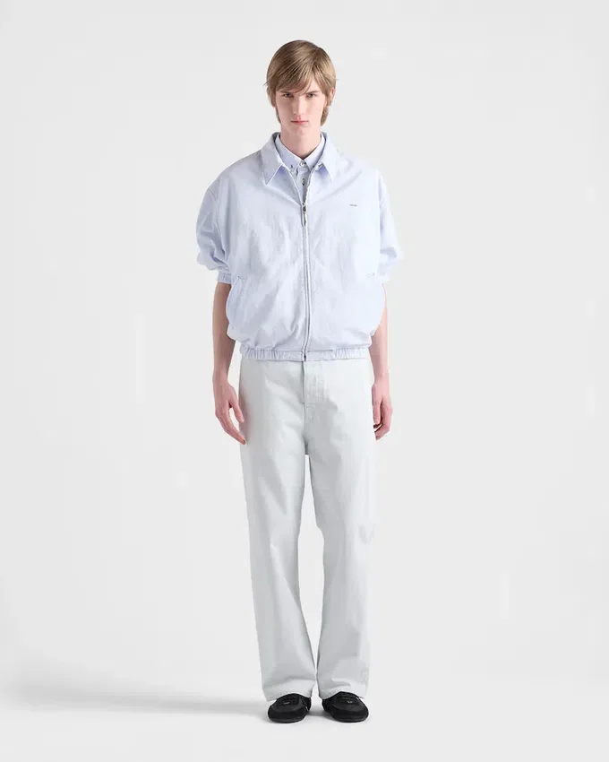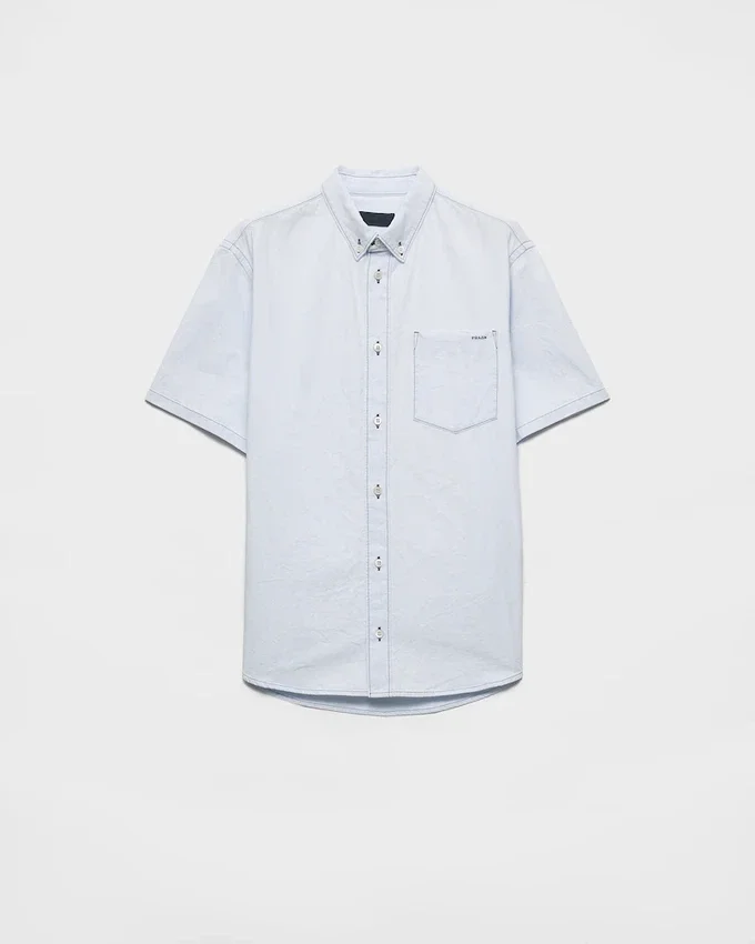 A Soft Feel and Fine Texture Make This Short-Sleeved Chambray Shirt a Structured Garment Perfect for Summer. The Classic Silhouette Expresses Timeless Allure While the Fabric Triangle Logo Adds an Iconic Note.