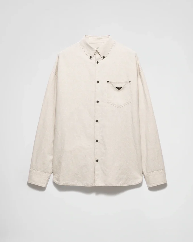 A Soft Touch and Fine Texture Make This Chambray Shirt a Structured Garment Perfect for Summer. The Boxy Silhouette Expresses Contemporary Charm, While the Metal Triangle Logo Adds an Iconic Note.