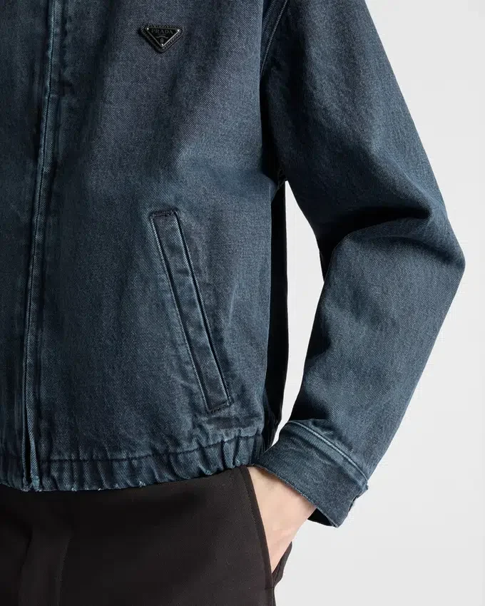 This Versatile and Contemporary Blouson Jacket Has a Sleek Design Enhanced by Over-Dyed Denim Rich in Nuances and with a Unique Look. The Sophisticated, Casual Garment is Completed with the Enameled Metal Triangle Logo.
