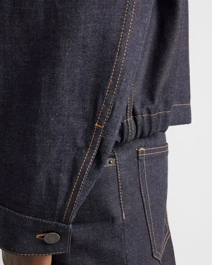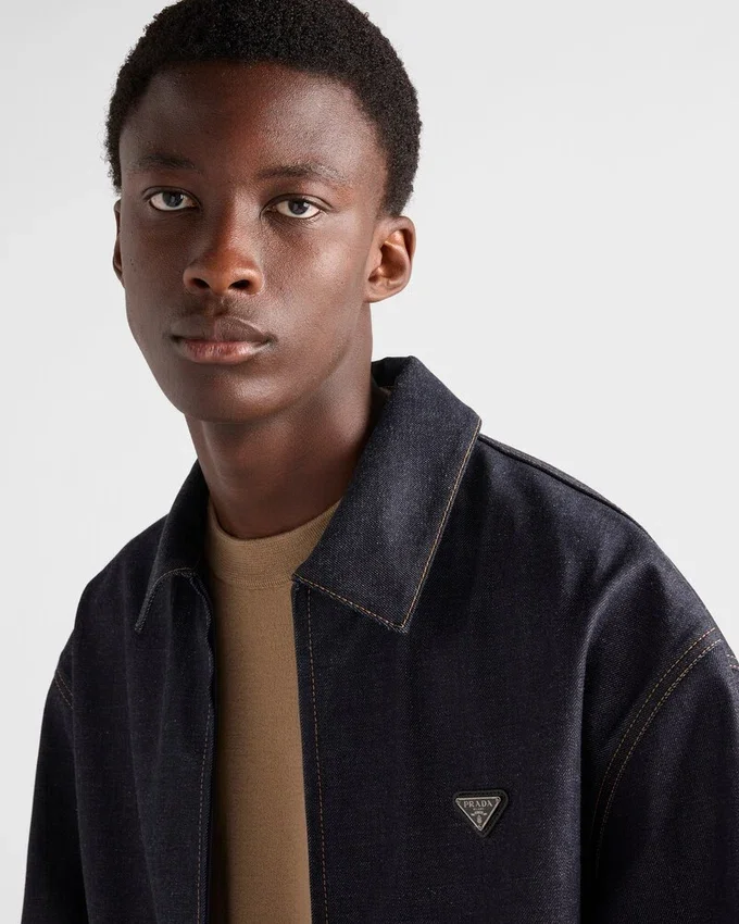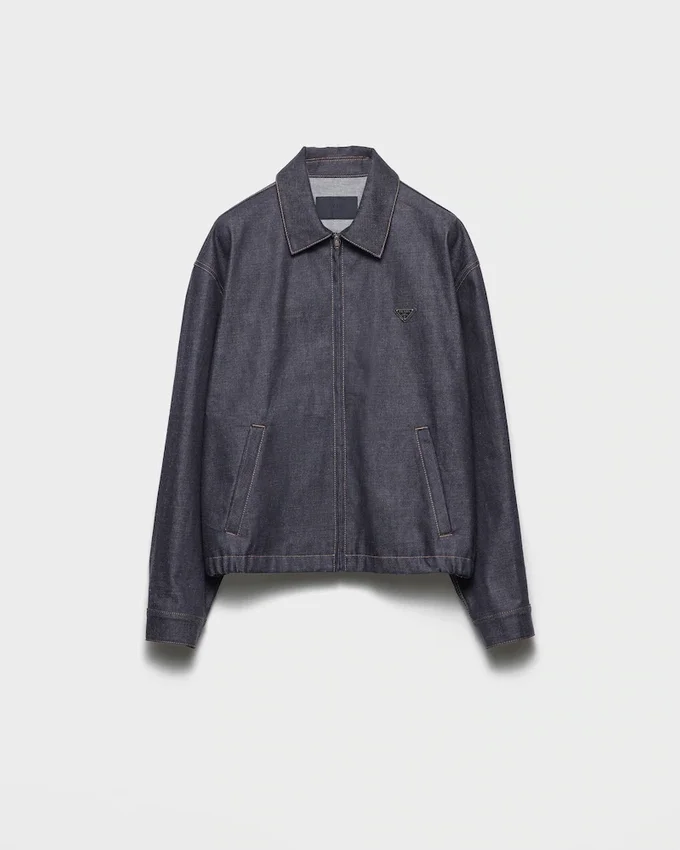 This Versatile and Contemporary Blouson Jacket Made of Raw Denim Has a Sleek Design Characterized by Contrasting Top-Stitching. The Sophisticated, Casual Garment is Completed with the Enameled Metal Triangle Logo.