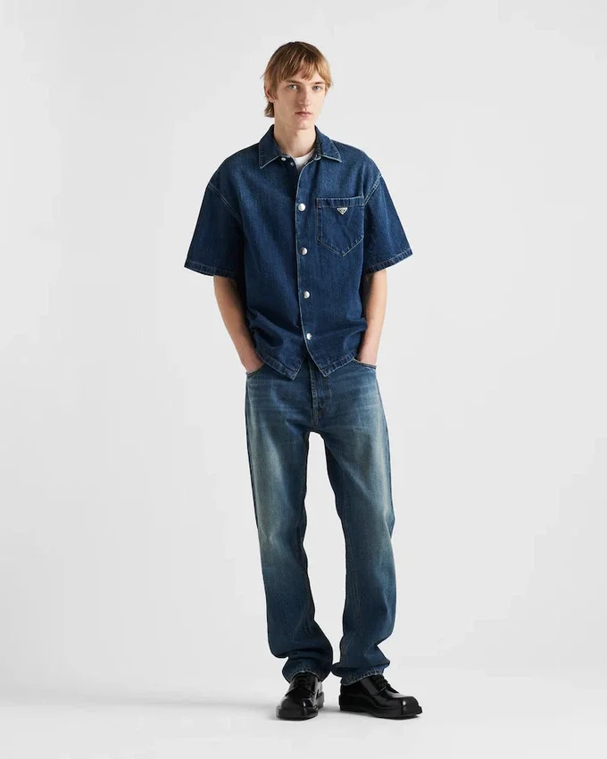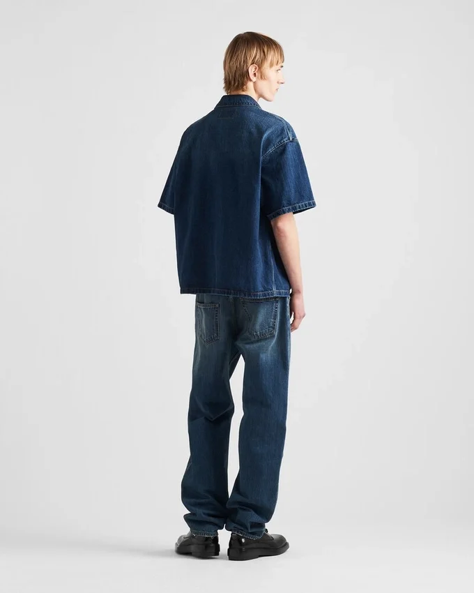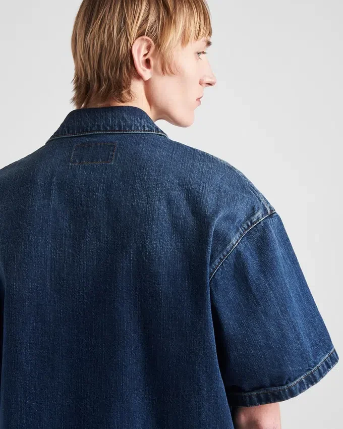This Denim Shirt with Oversized Lines and a Contemporary Style is Enriched by the Used Denim Treatment That Gives the Garment a Unique and Refined Vintage Look. The Short-Sleeve Style Has a Boxy Silhouette Defined by the Snap Closure for a Casual, Modern Touch. The Enameled Metal Triangle Logo on the Breast Pocket Completes the Look with Its Iconic Signature.