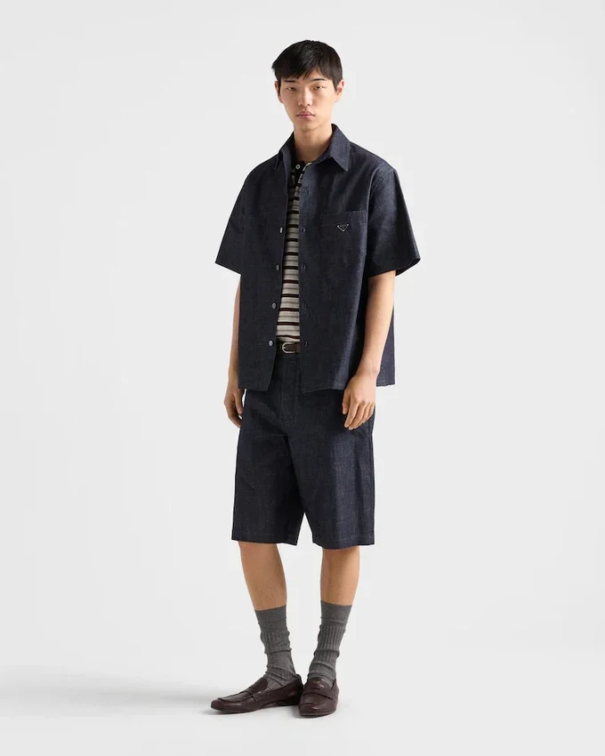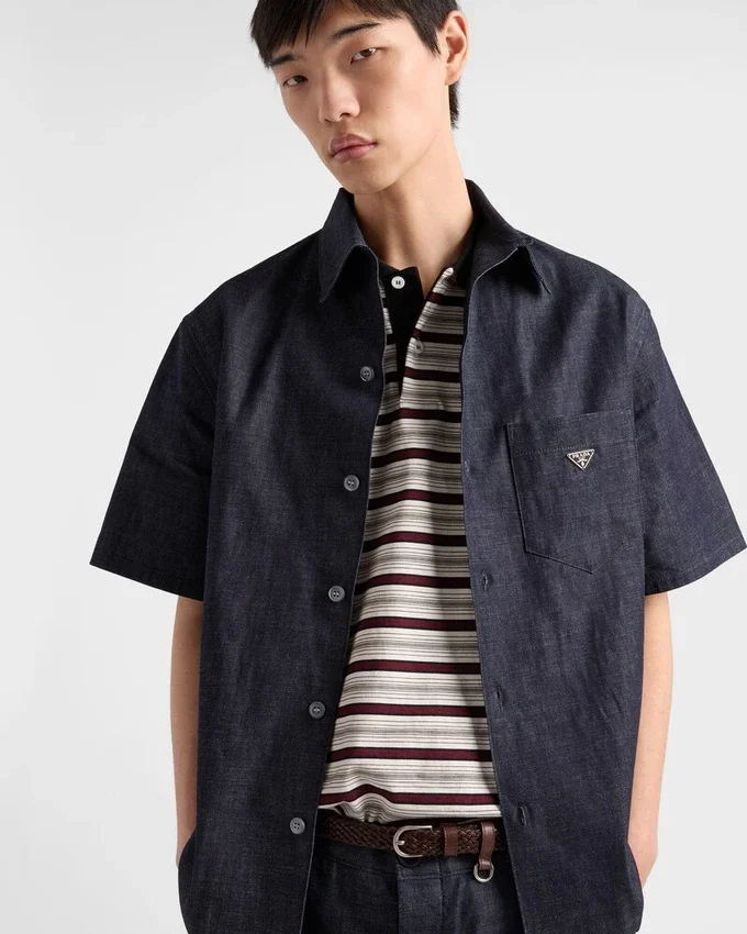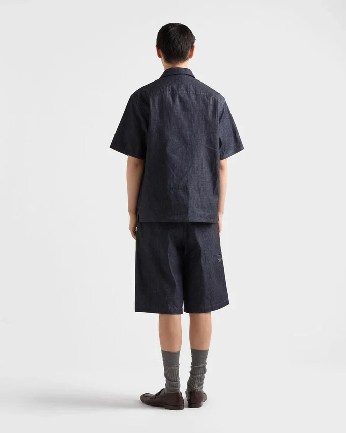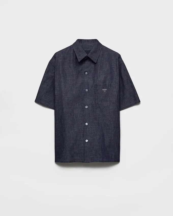This Short-Sleeved Shirt with a Straight, Boxy Cut is Made of Chambray Denim Treated for an Aged Effect That Gives It Vintage Charm. The Silhouette is Enriched by a Breast Pocket and the Iconic Triangle Logo on the Back.