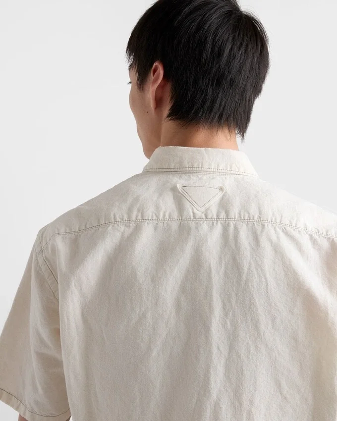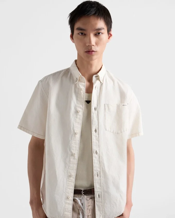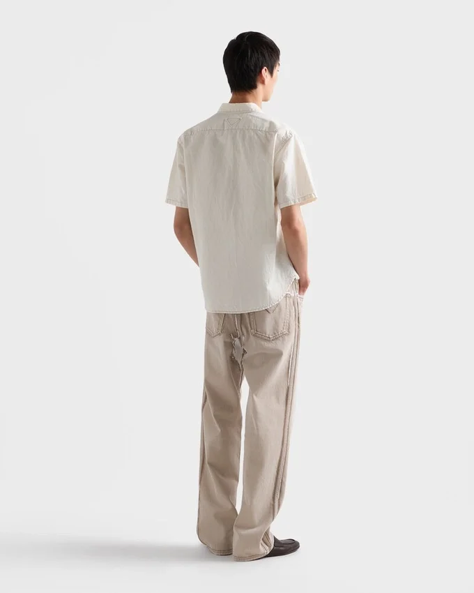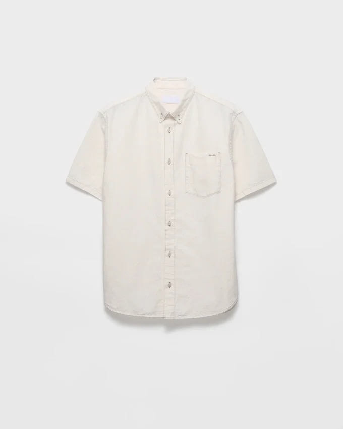 A Soft Feel and Fine Texture Make This Short-Sleeved Chambray Shirt a Structured Garment Perfect for Summer. The Classic Silhouette Expresses Timeless Allure While the Fabric Triangle Logo Adds an Iconic Note.