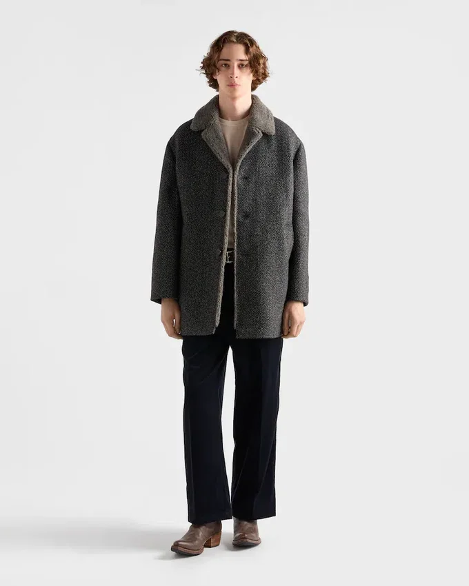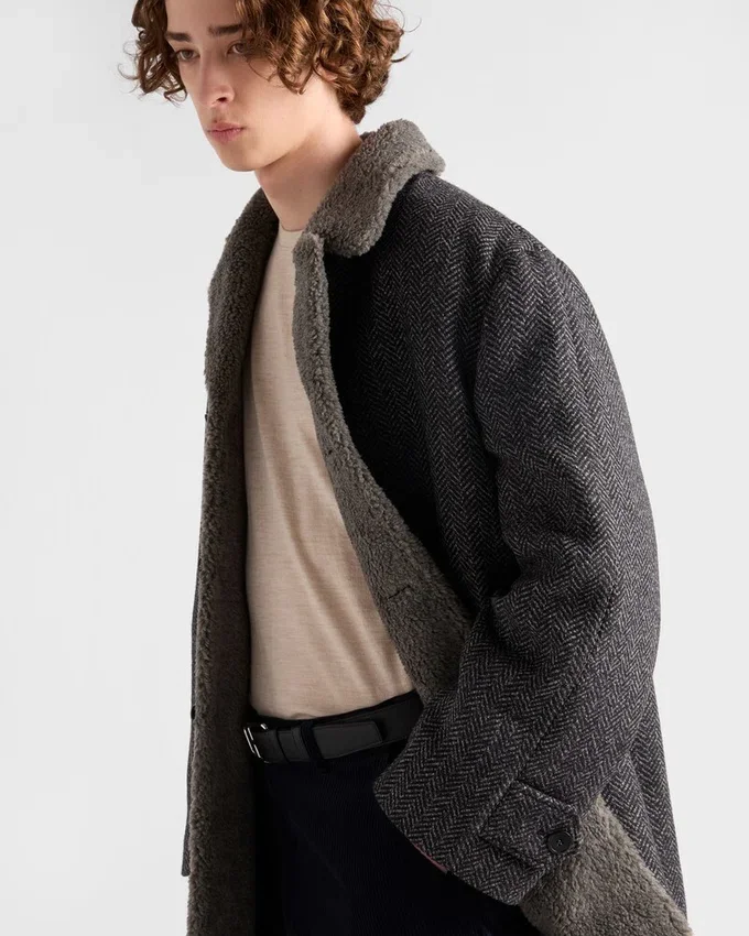 The Combination of Sophisticated Winter Textures Gives This Straight-Cut Coat a Distinctive Character. The Outerwear Made of Wool with a Chevron Pattern is Completed with a Soft Shearling Lining.