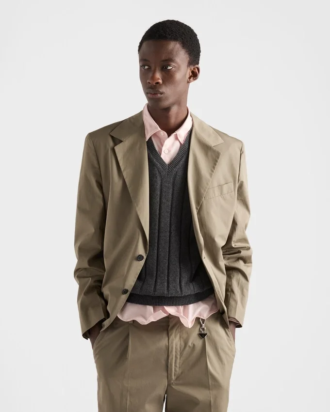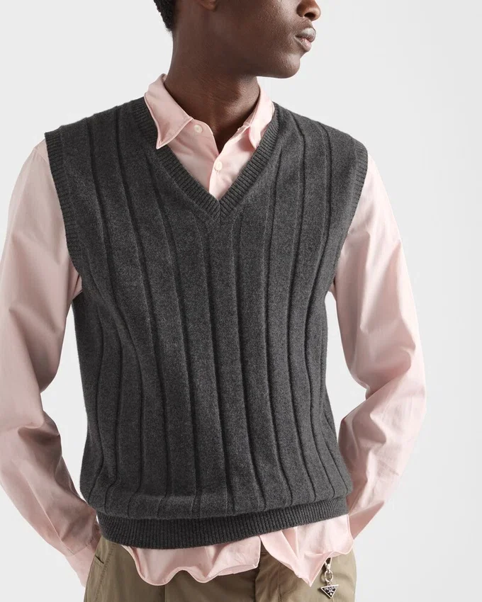 A Slim Silhouette Characterizes This Vest Made of Fine Cashmere. The Ribbed Knit Pattern Adds Depth to the Style Decorated with the Triangle Logo on the Back.