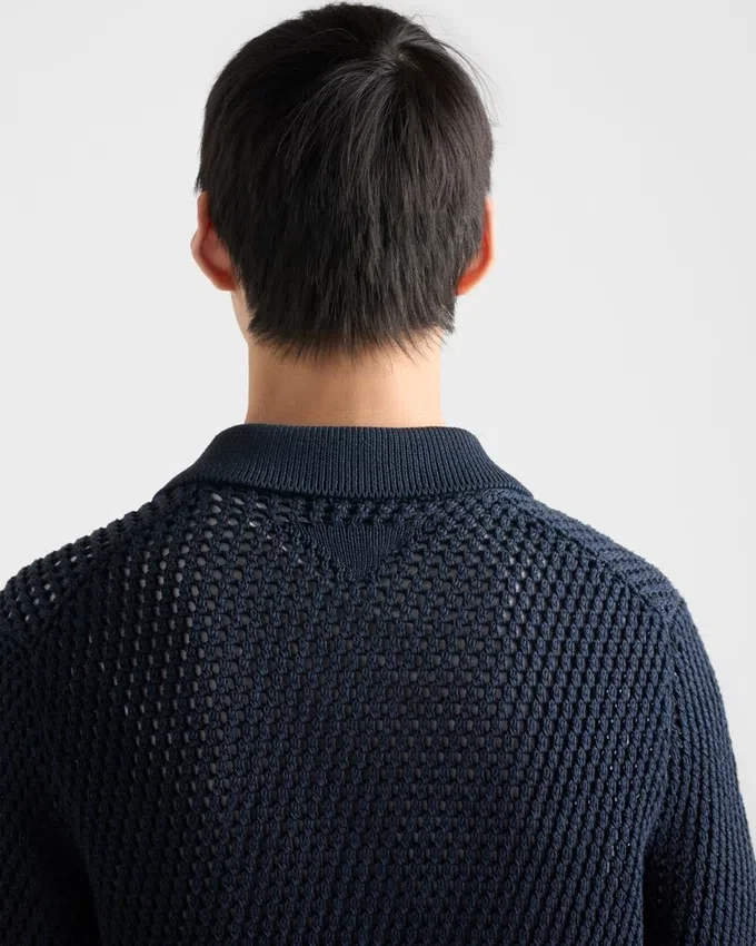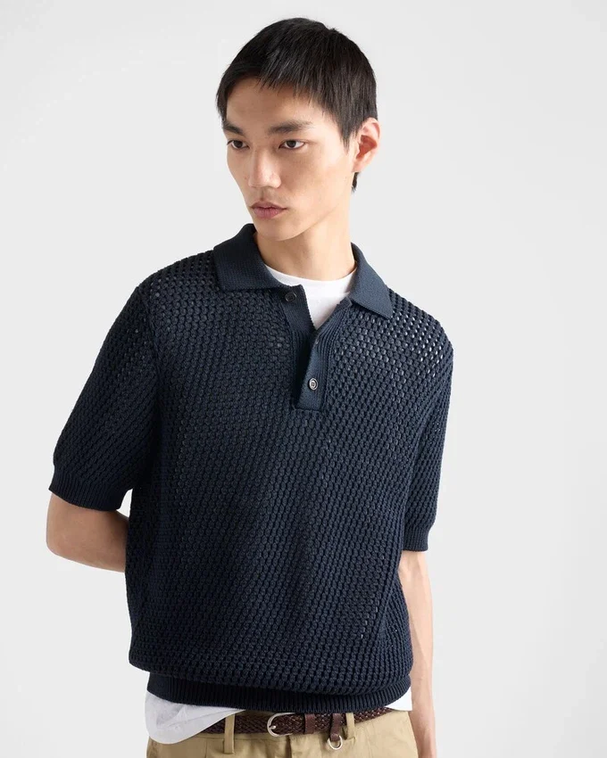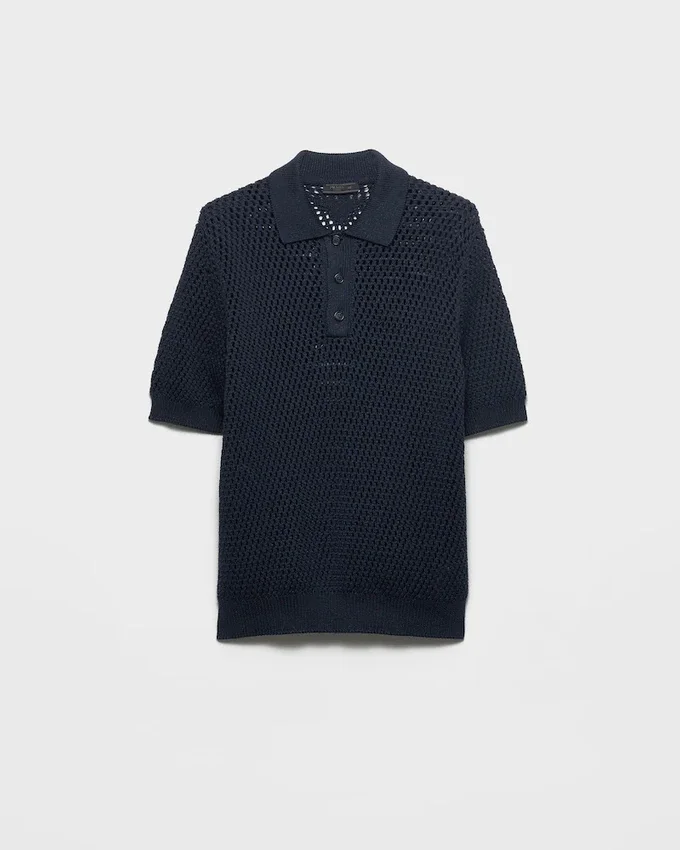 A Honeycomb Knit Pattern Gives This Linen and Cotton Polo Shirt Novel Lightness. This Style with Polo Collar is a Versatile Garment Decorated with the Triangle Logo on the Back.