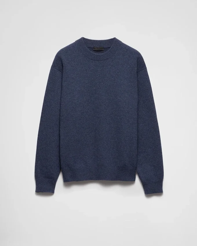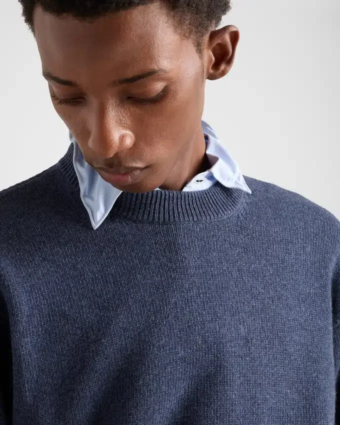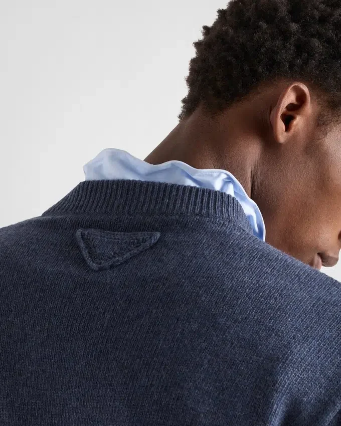 Classic Lines and Sleek Details Define This Refined Sweater Made of Soft Regenerated Cashmere with Ribbed Knit Trim. The Tonal Triangle Logo Completes the Refined and Versatile Style.