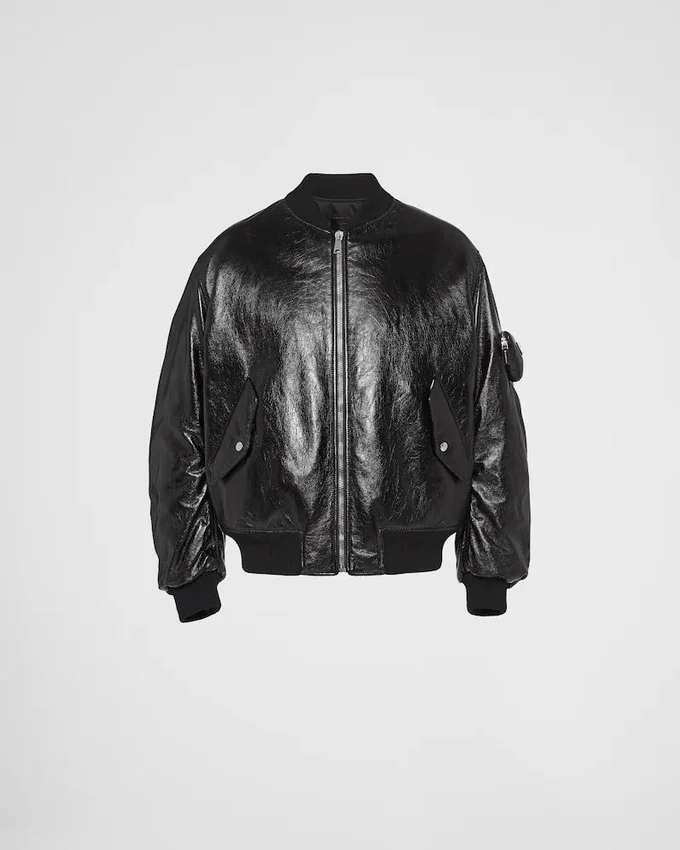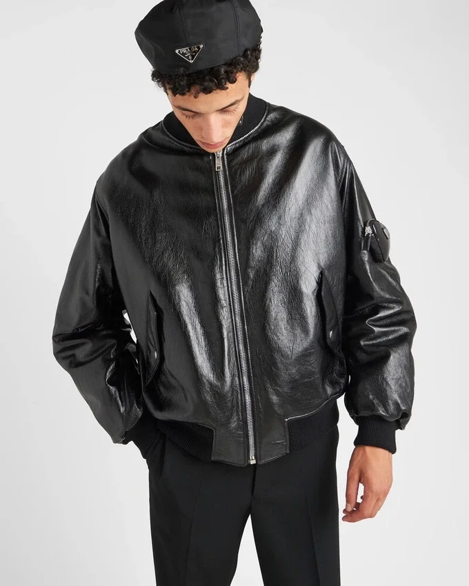 Prada Continues to Play with the Classic Shape of the Bomber Jacket, Giving Formality to a Universal Garment Made of Leather and Treated by Hand to Create a Glossy, Vintage Effect. Dignity is Given to Pragmatic Clothing and Real-Life Uniforms. Reinterpreted in a Conceptual Way, the Iconic Prada Triangle Takes on a Structural Role in the Garment, Transforming into a Pouch Applied to the Sleeve and Decorated with the Enameled Metal Triangle Logo.