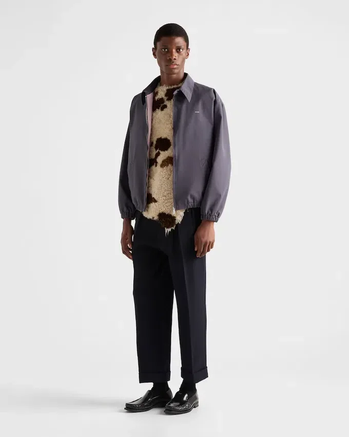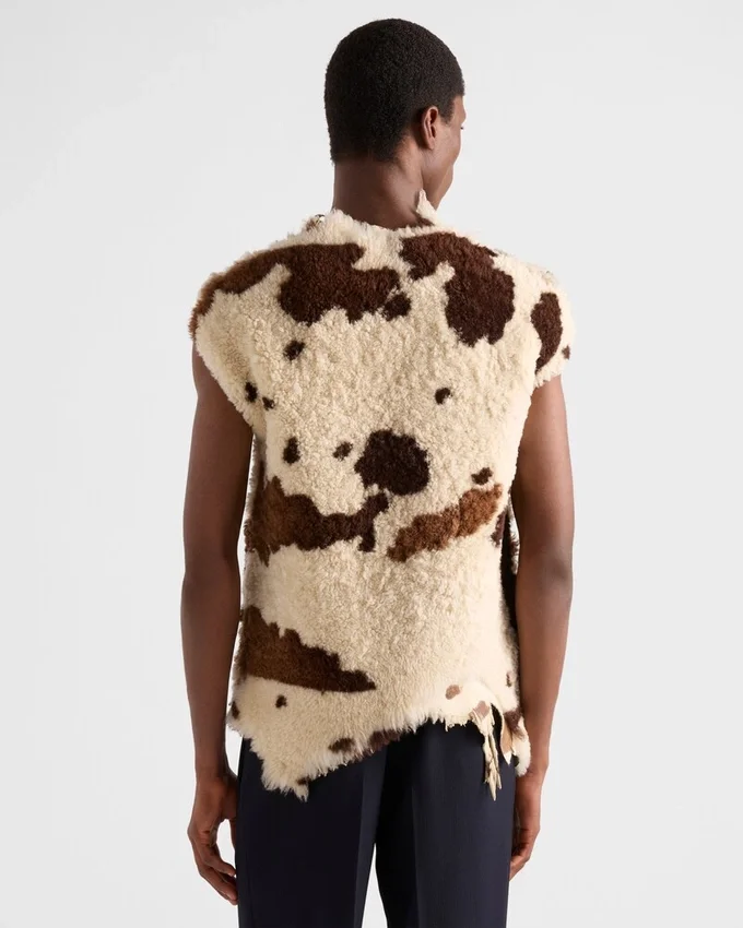 Miuccia Prada and Raf Simons Explore Nature and Human Impulses as Drivers of Creativity, Designing a Menswear Collection with Sharp Contrasts. This Soft Shearling Vest Wraps the Body Naturally, Forming an Asymmetrical Silhouette Obtained Through Raw-Cut Edges. The Surface is Enriched by an Abstract Animal Print That Enhances the Texture and Gives the Garment Distinctive Character.