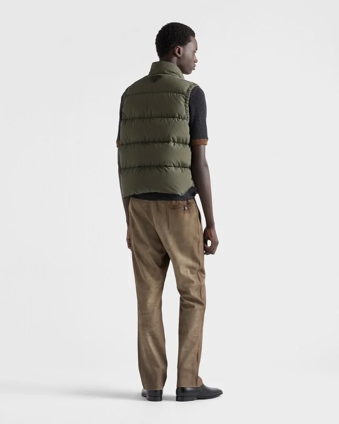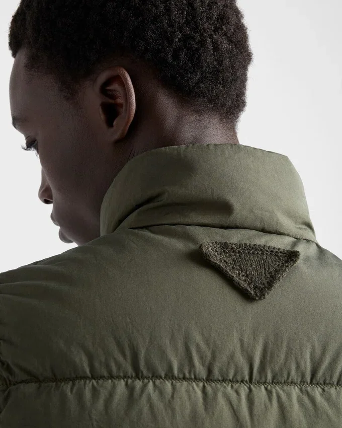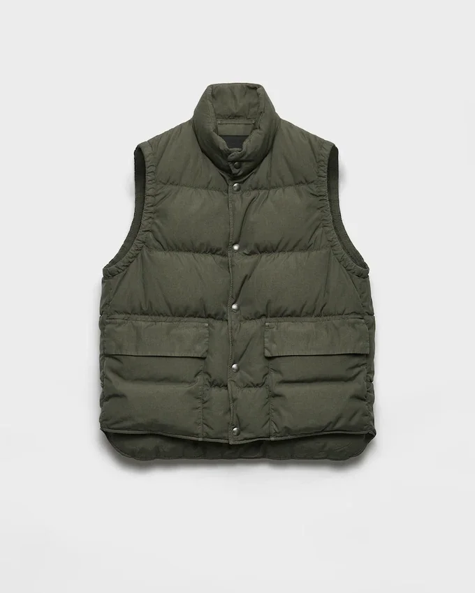 This Down Vest with a Versatile Design and Functional Details Has a Contemporary Silhouette Decorated with the Tonal Triangle Logo. The Cotton Garment with Goose Down Padding Features a Stand-Up Collar and Two Large Pockets.