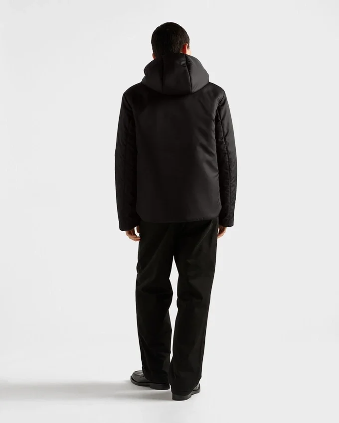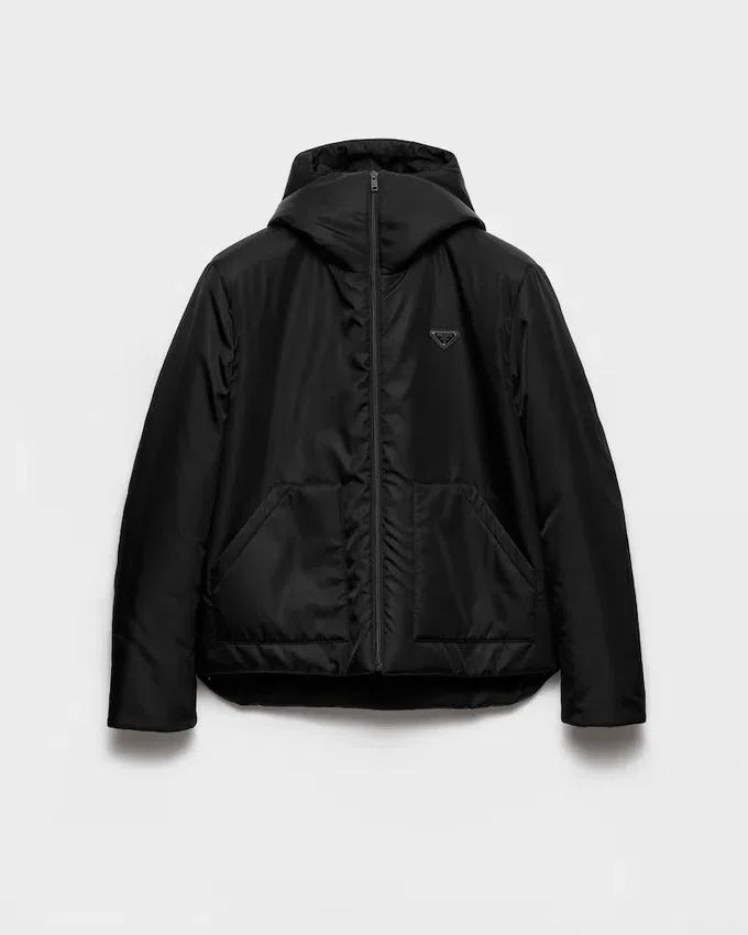 This Contemporary and Refined Jacket is Made of Re-Nylon with a Sleek Silhouette Enriched with Light Padding. Functional Details Complete the Hooded Garment Decorated with the Enameled Metal Triangle Logo. For Sustainable Care to Preserve the Product’s Characteristics and Reduce Microfiber Shedding, We Recommend Not Washing the Item Too Often. Let the Product Air out After Every Use and Have It Dry Cleaned at a Specialized Ecological Dry Cleaners.
