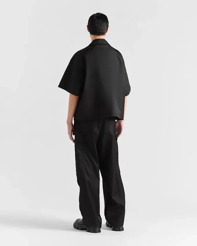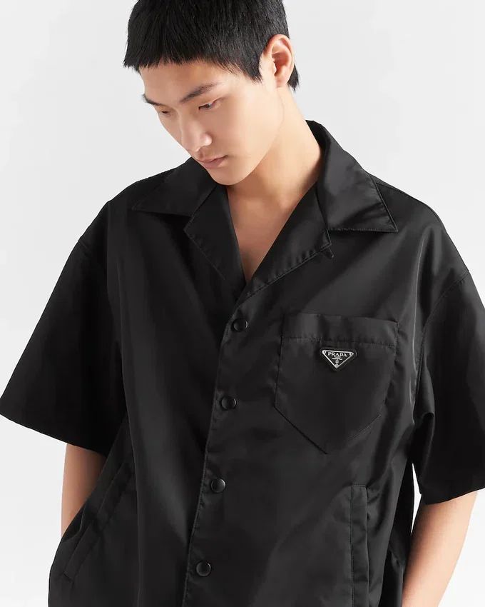 This Short-Sleeved Boxy Fit Shirt Has a Modern Personality. Made of Innovative Re-Nylon Fabric, It Has a Distinctive Bowling Collar and Snap Closure. The Enameled Metal Triangle Logo on the Breast Pocket Makes the Garment Iconic. For Sustainable Care to Preserve the Product’s Characteristics and Reduce Microfiber Shedding, We Recommend Not Washing the Item Too Often. Let the Product Air out After Every Use and Have It Dry Cleaned at a Specialized Ecological Dry Cleaners.
