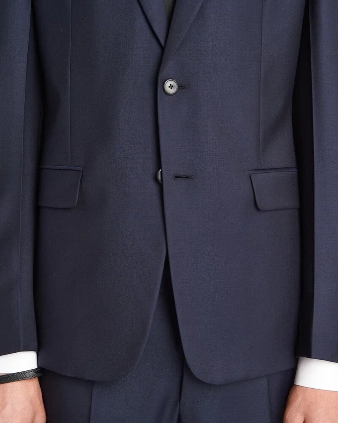 This Single-Breasted Slim-Fit Suit Stands out for Its Sophisticated Tailoring. The Jacket with a Two-Button Closure Has a Classic Lapel and Back Vent, While the Pants Have Angled Slash Pockets on the Front and Welt Pockets on the Back.