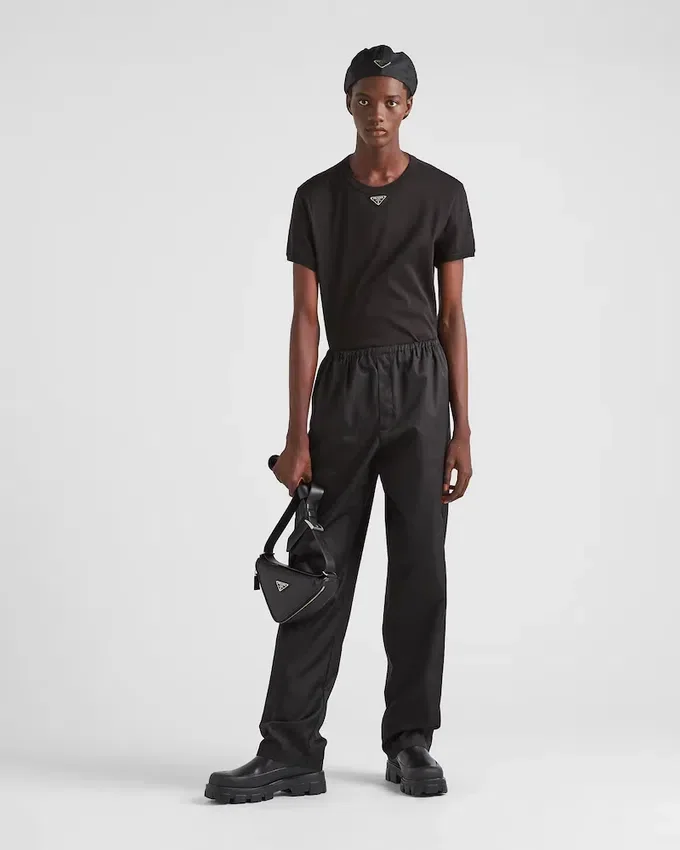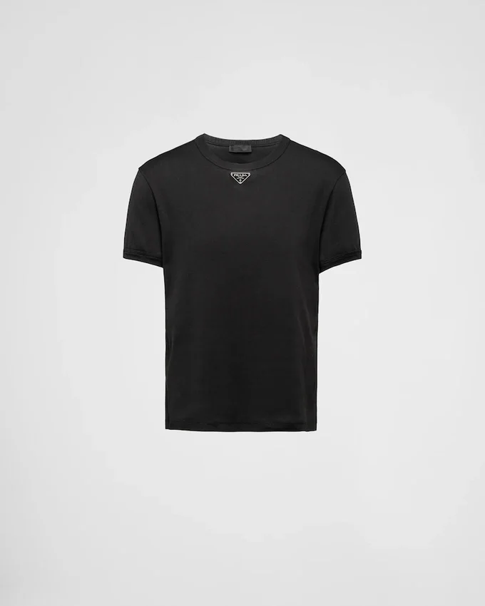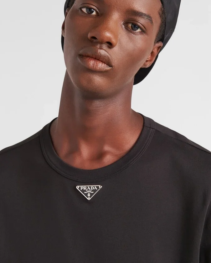 This Short-Sleeved Cotton Tee Has a Skinny Fit and a Ribbed Knit Crew Neck. The Garment is Decorated with the Iconic Enameled Metal Triangle Logo on the Front.