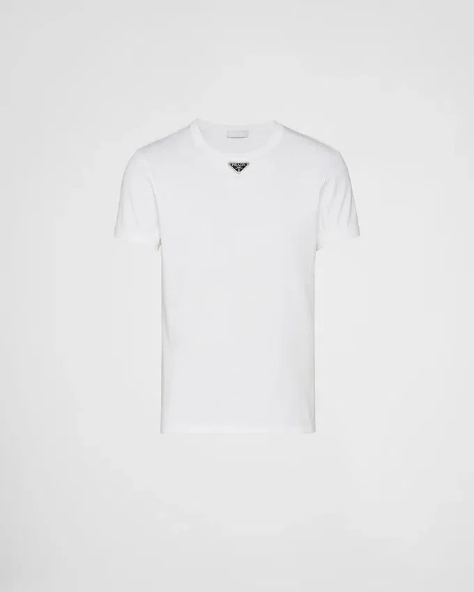 This Short-Sleeved Cotton Tee Has a Skinny Fit and a Ribbed Knit Crew Neck. The Garment is Decorated with the Iconic Enameled Metal Triangle Logo on the Front.
