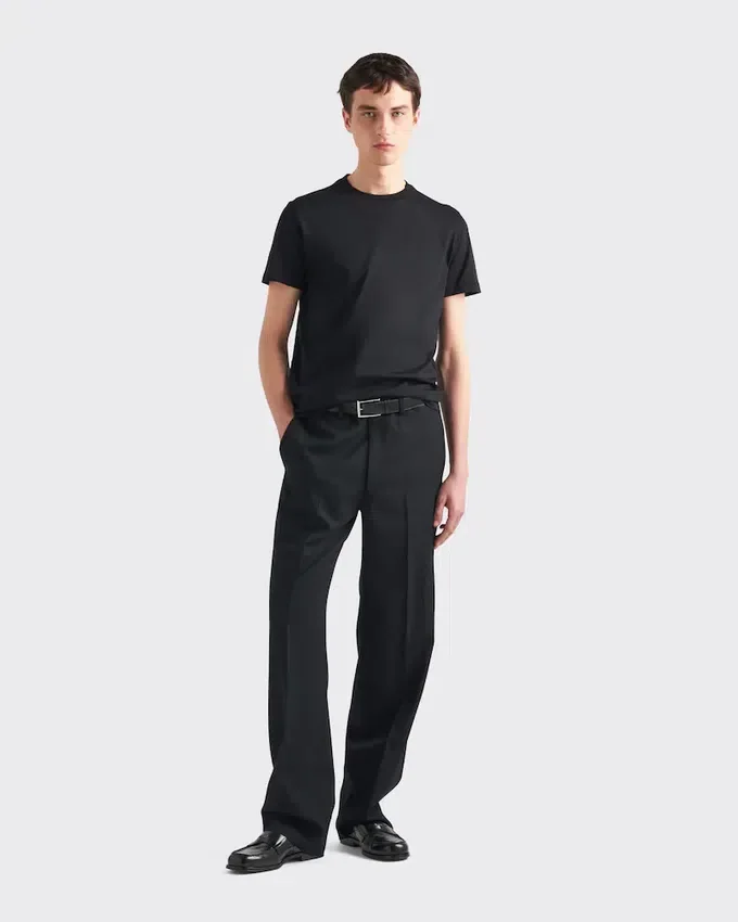 This Short-Sleeved Cotton T-Shirt with Ribbed Knit Crew Neck Has a Slim Fit. The Garment is Decorated with the Iconic Sartorial Label Accompanied by the Emblematic Triangle Logo Presented in a Conceptual Version as a Fabric Patch.