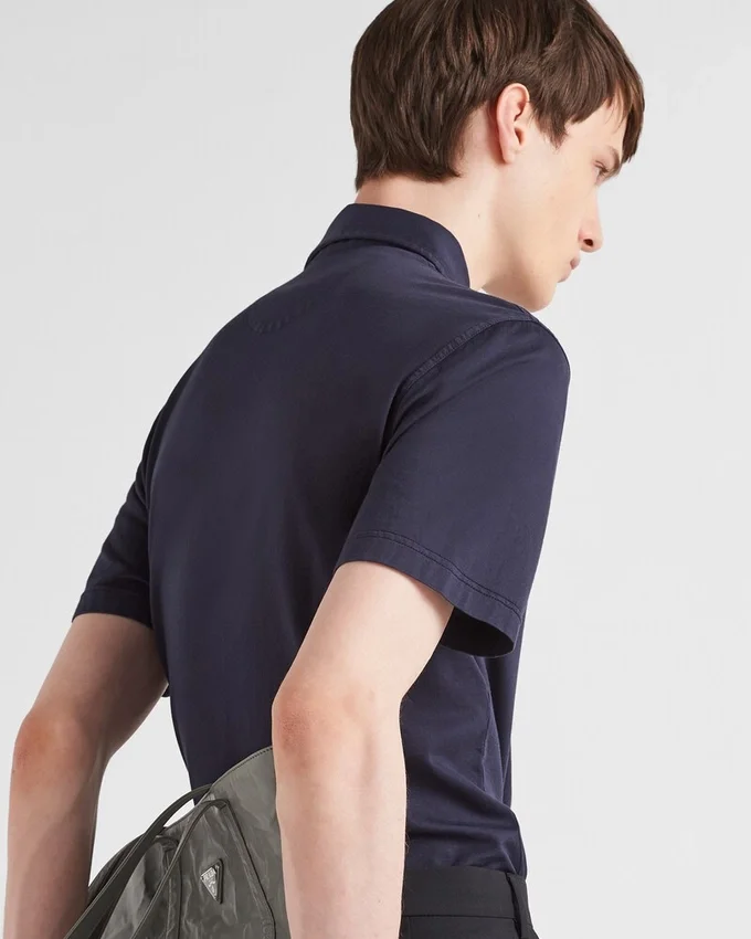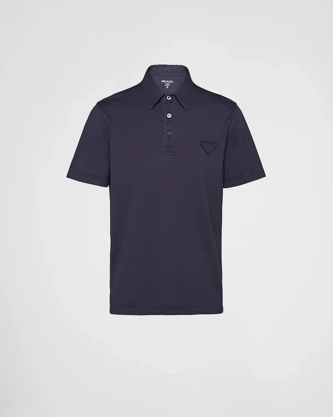 This Cotton Polo Shirt with Minimalist Lines and Boxy Silhouettes Expresses Casual but Refined Style. The Design with Sleek Lines is Embellished with Mother-Of-Pearl Buttons and is Decorated with the Tonal Fabric Triangle Logo.