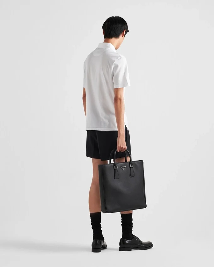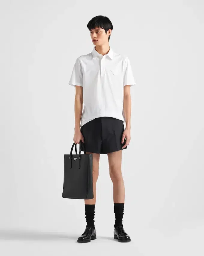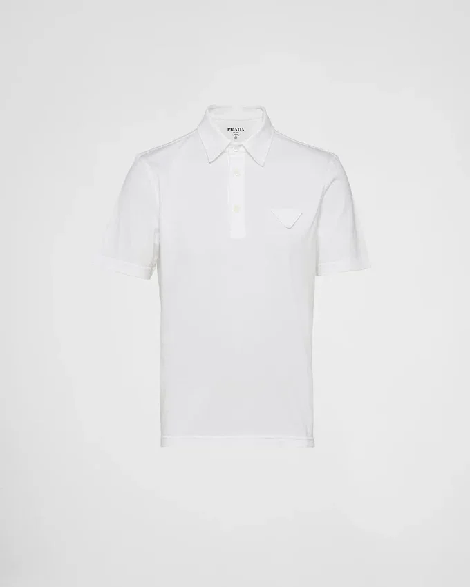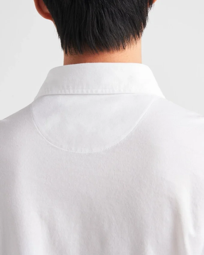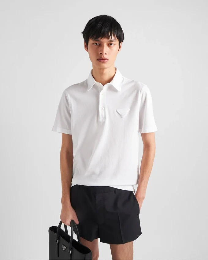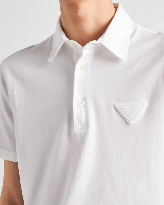 This Cotton Polo Shirt with Minimalist Lines and Boxy Silhouettes Expresses Casual but Refined Style. The Design with Sleek Lines is Embellished with Mother-Of-Pearl Buttons and is Decorated with the Tonal Fabric Triangle Logo.