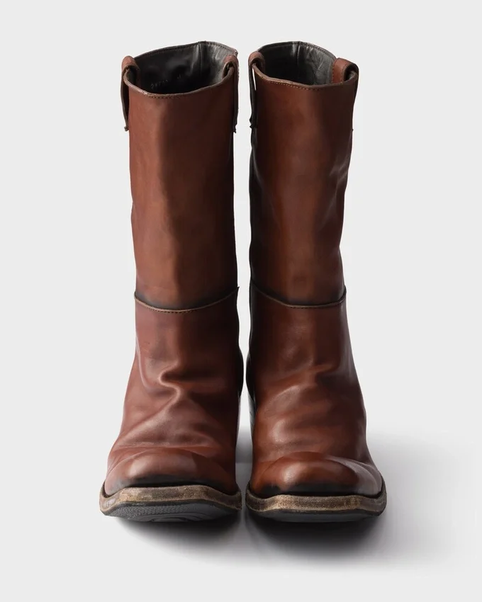 An Unexpected Balance Between Contrasting Styles Defines These Leather Boots, a Reinterpretation of the Classic Biker Silhouette with Influences from a Western Aesthetic. An Innovative, Hybrid Language Defines the Style, Characterized by Bold Geometric Shapes and an Aged Effect Created with Innovative Artisan Techniques, an Expression of Authentic and Instinctive Style.