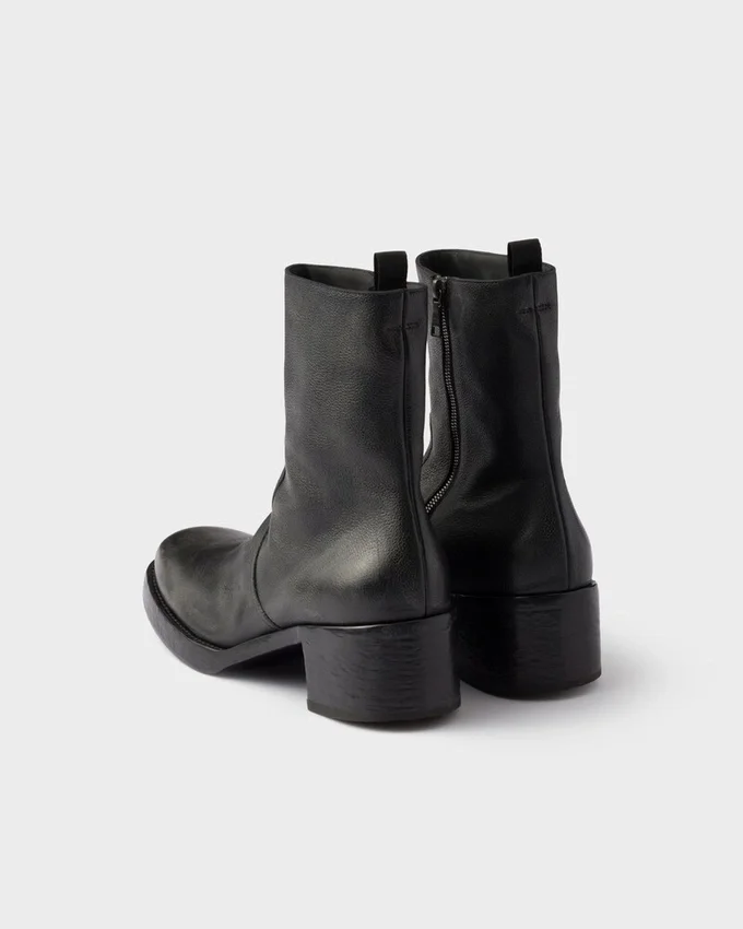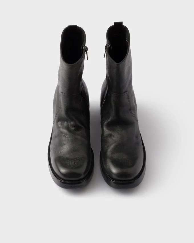 Balancing Structure and Fluidity, These Booties Reinterpret the Bold Style of ’70S Footwear with Contemporary Lines and Innovative Details. Unusual Combinations Define the Distinctive Design, Characterized by a Round Toe with Emphasized Volumes That Ends in a Slim Boot Leg. The Aged Leather Gives Depth and Uniqueness to the Footwear, an Expression of an Authentic and Instinctive Style.