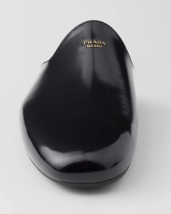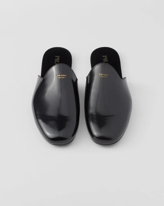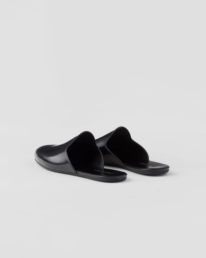 Brushed Leather, an Emblematic Material of Prada Collections, Gives These Minimalist Slippers Sophisticated Allure. The Tapered Silhouette, Characterized by Thin Rubber Soles, is Completed with Insoles for Greater Comfort. The Screen-Printed Lettering Logo on the Upper Enhances the Sleek and Contemporary Elegance of the Footwear.