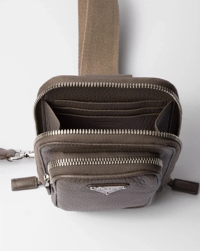 This Multifunctional and Contemporary Smartphone Case is Made of Leather with a Sleek Design. Zipper Pockets and the Adjustable Shoulder Strap Complete the Look, Decorated with the Enameled Metal Triangle Logo.