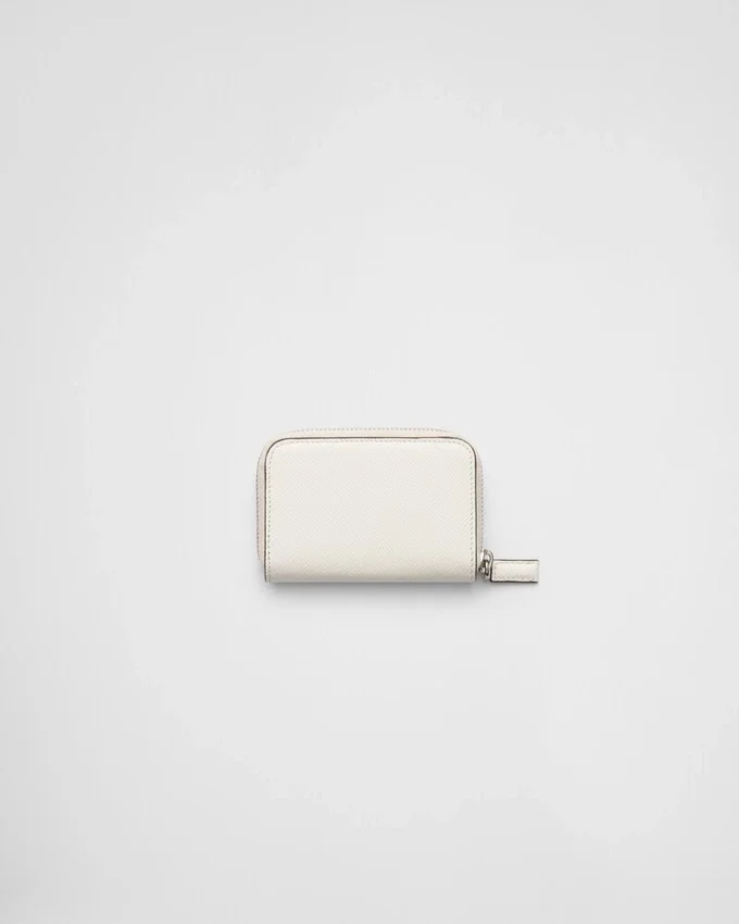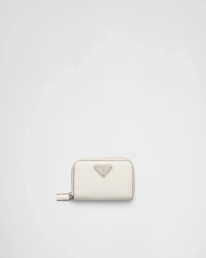 This Saffiano Leather Coin Purse Stands out for Its Sleek Design. The Accessory with Two Card Slots and an Internal Pocket is Decorated with the Iconic Enameled Metal Triangle Logo.