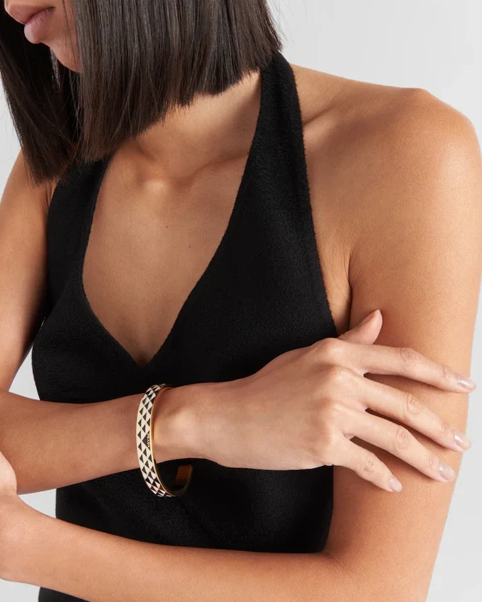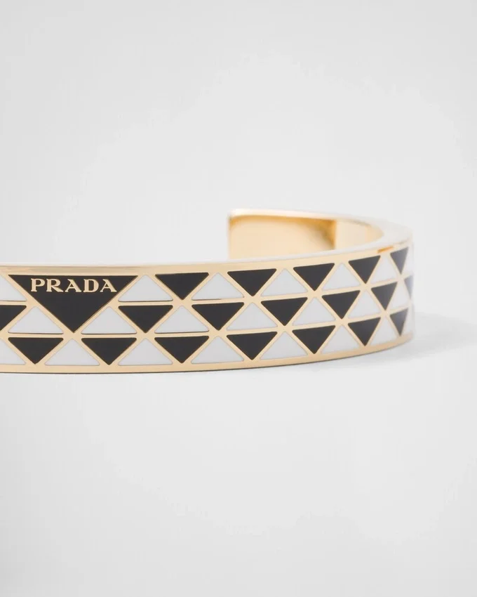 The Iconic Triangle, the Distinctive Signature of Prada Collections, is Transformed into a Geometric Pattern That Embellishes This Enameled Metal Bracelet. The Accessory with Sleek, Contemporary Lines is Decorated with the Lettering Logo That Completes the Bangle Design with an Iconic Note.