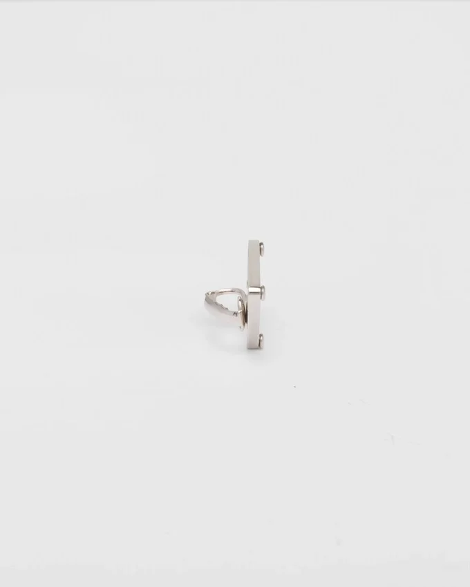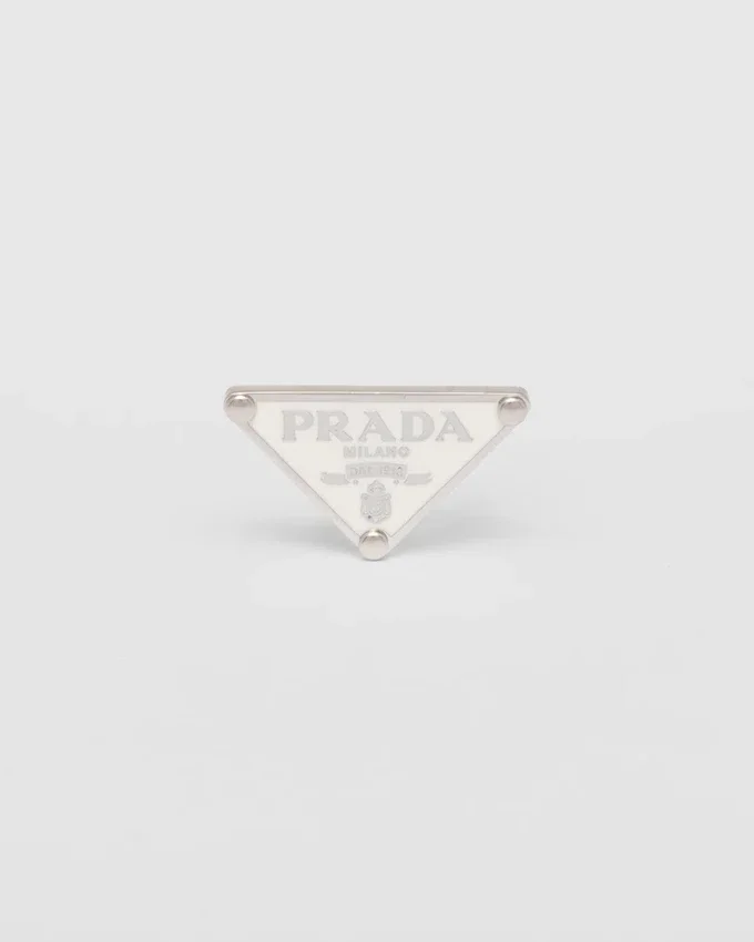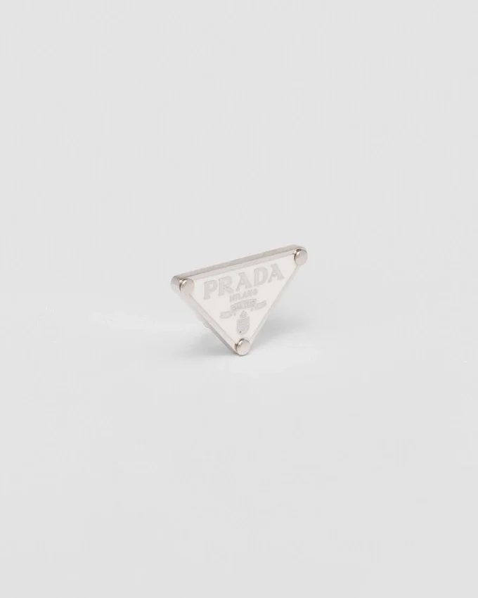 Prada’s Historic Symbol Decorated with Enamel Defines This Single Earring Worn on the Left. Iconic and Sleek, the Triangle Logo is the Protagonist of a New Line of Jewelry Made of 925 Sterling Silver That Reinterprets Punk Influences in a Modern Way.
