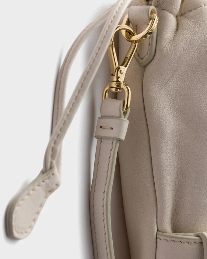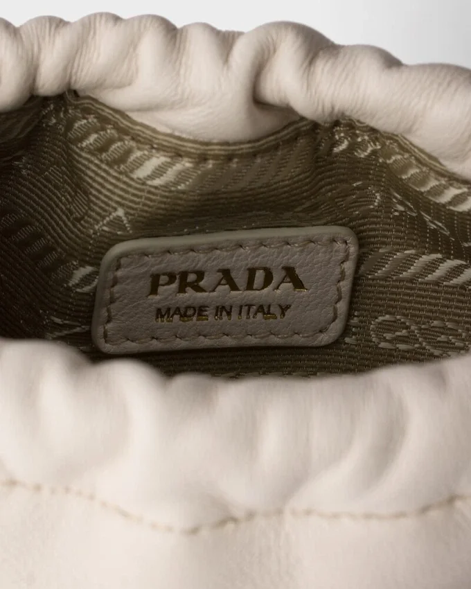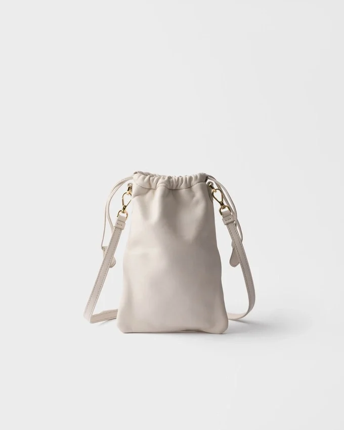 Prada Reimagines the Iconic Drawstring Pouch Design with Functional Details Like the Shoulder Strap and Front Pocket with Strap and Buckle.