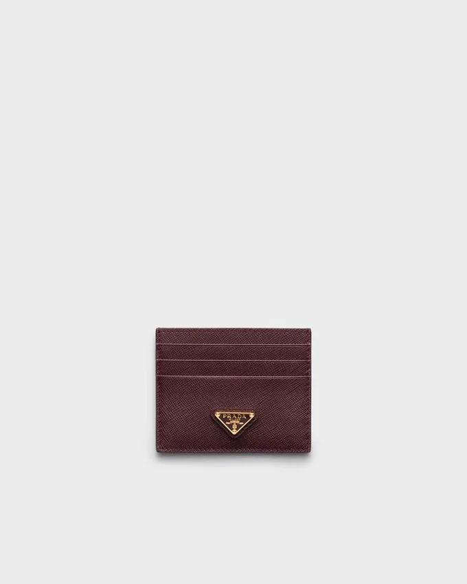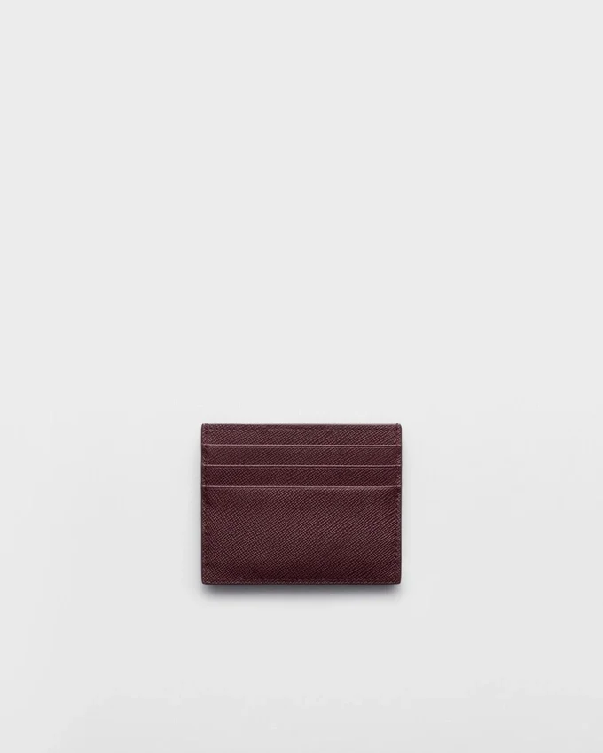 The Unmistakable Texture of Saffiano Leather Characterizes This Sleek Card Holder. The Accessory with Six Card Slots is Decorated with a Tonal Enameled Metal Triangle Logo.