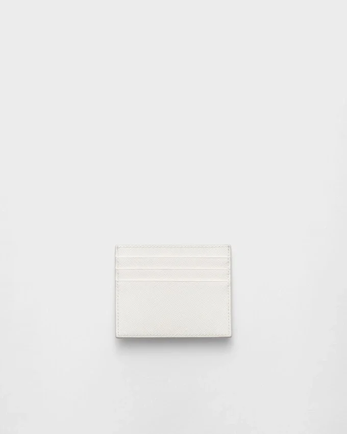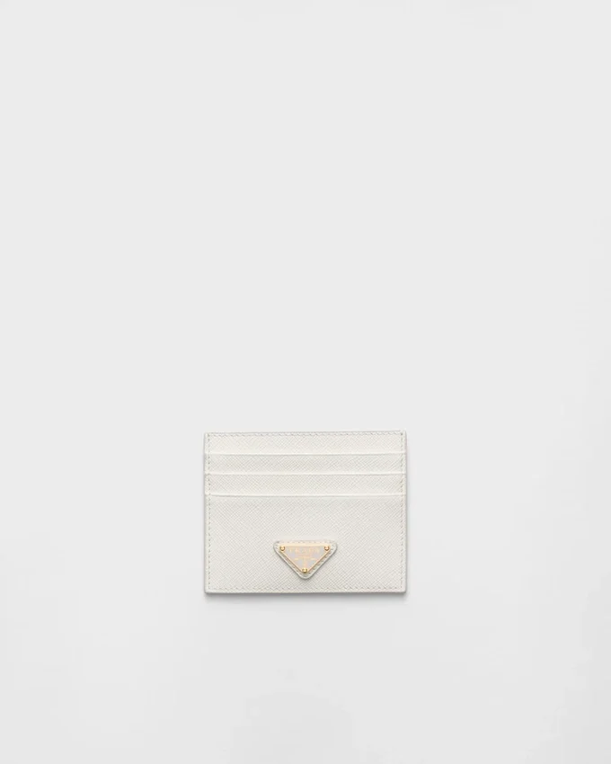 The Unmistakable Texture of Saffiano Leather Characterizes This Sleek Card Holder. The Accessory with Six Card Slots is Decorated with a Tonal Enameled Metal Triangle Logo.
