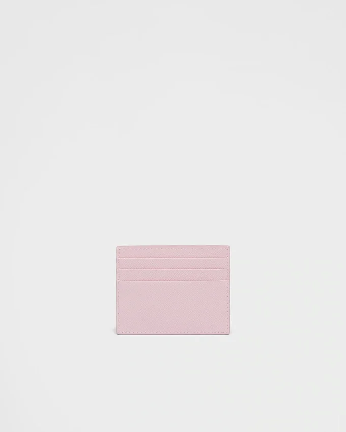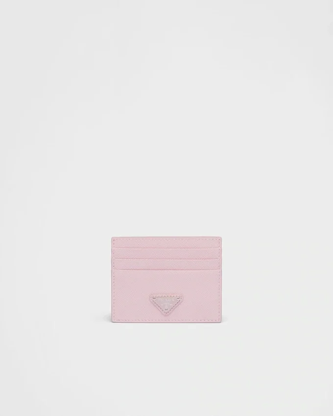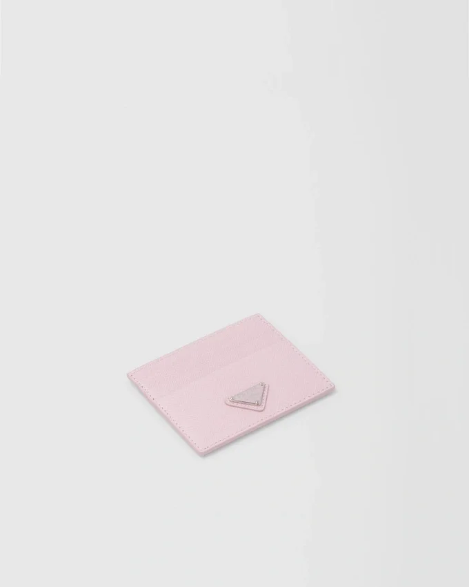 The Unmistakable Texture of Saffiano Leather Characterizes This Sleek Card Holder. The Accessory with Six Card Slots is Decorated with a Tonal Enameled Metal Triangle Logo.