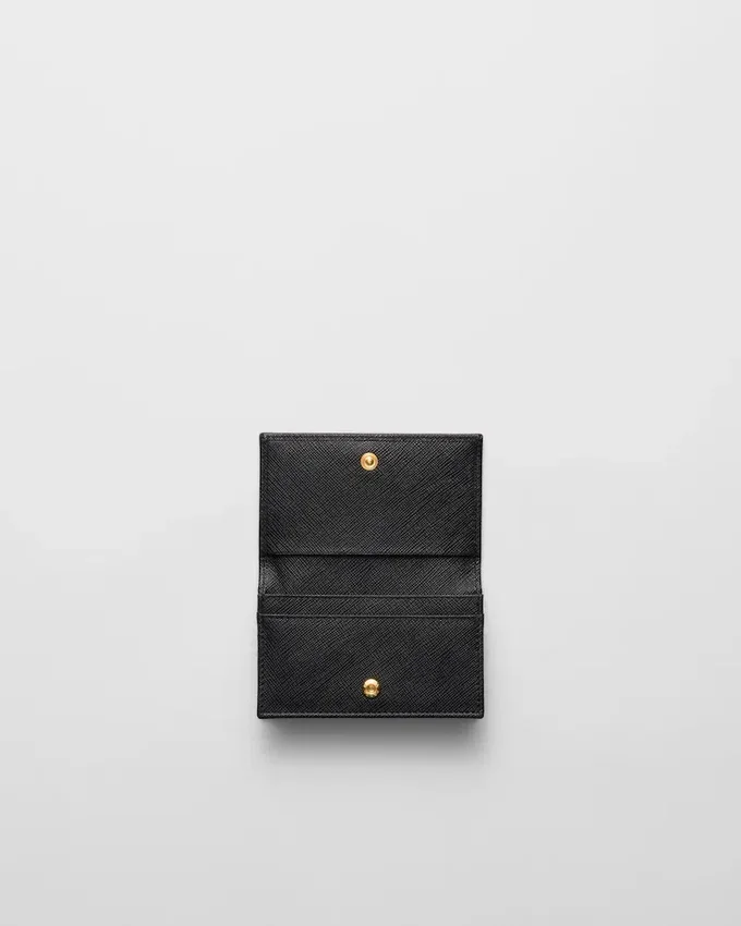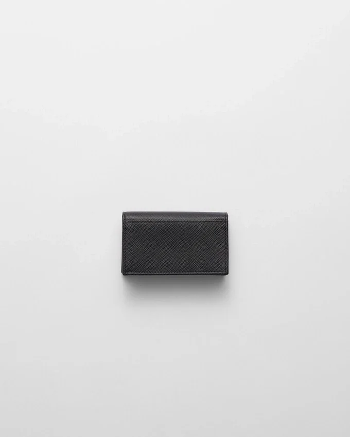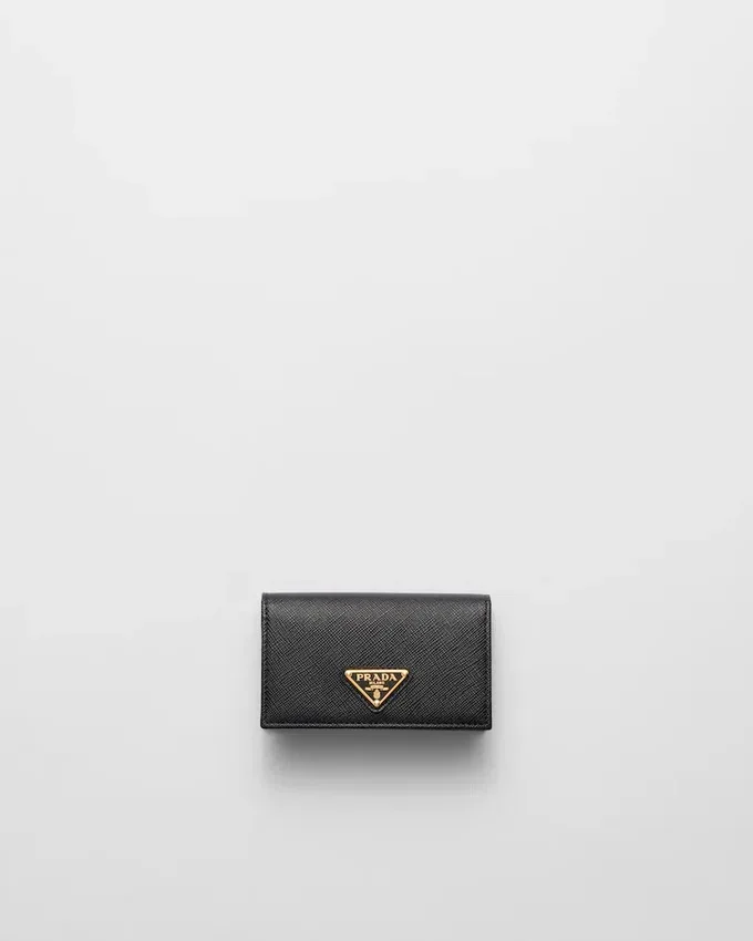 Made of Fine Saffiano Leather, an Iconic Material of the Brand, This Elegant Card Holder is Decorated with Prada’s Enameled Metal Triangle Logo. The Accessory Has a Snap Closure and Four Card Slots Inside.