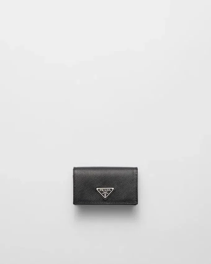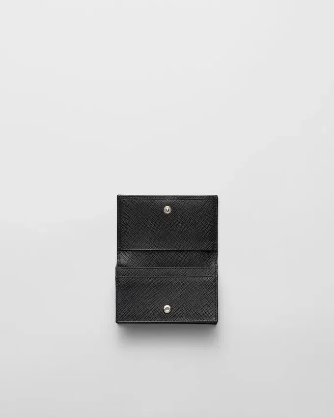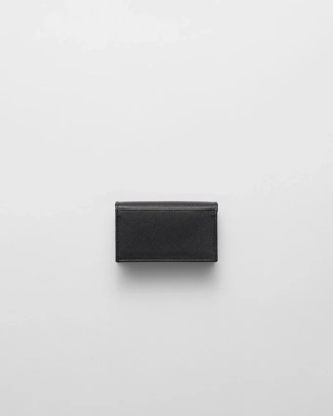 Made of Fine Saffiano Leather, an Iconic Material of the Brand, This Elegant Card Holder is Decorated with Prada’s Enameled Metal Triangle Logo. The Accessory Has a Snap Closure and Four Card Slots Inside.