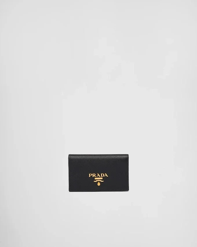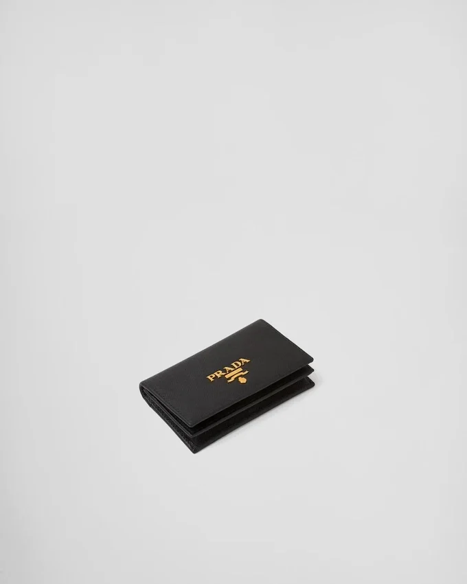 This Saffiano Leather Credit Card Holder is Decorated with Gold-Toned Prada Lettering. The Snap Closure Opens to Two Slots for Cards or Tickets.