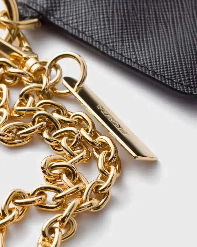 This Sophisticated and Versatile Card Holder Has a Removable Chain Shoulder Strap That Allows It to Be Worn in Different Ways. The Triangle Logo Decorates the Front of This Accessory Made of Saffiano Leather, the Iconic Material of the Brand Defined by Its Crosshatch Texture and Waxed Finish.