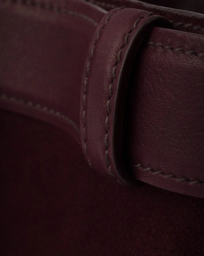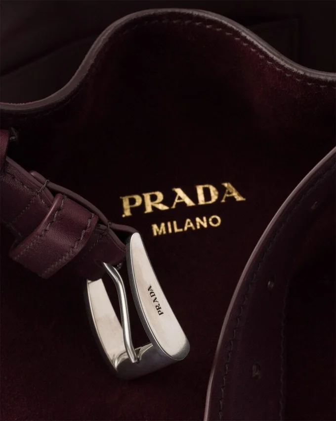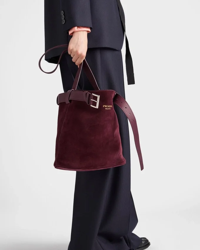The Sophisticated and Modern Essence of the Prada Buckle Bag is Rediscovered in a New Bucket Silhouette with Sleek Lines. The Refined, Soft Texture of Suede Enhances the Pure Geometric Shape of the Style, Enriched with the Distinctive Belt with Iconic Buckle.
