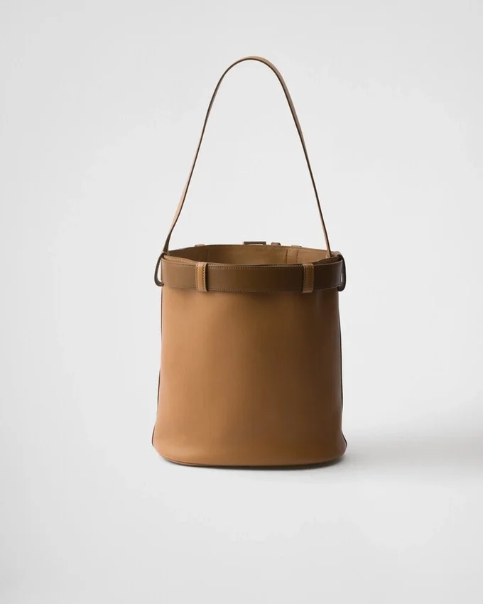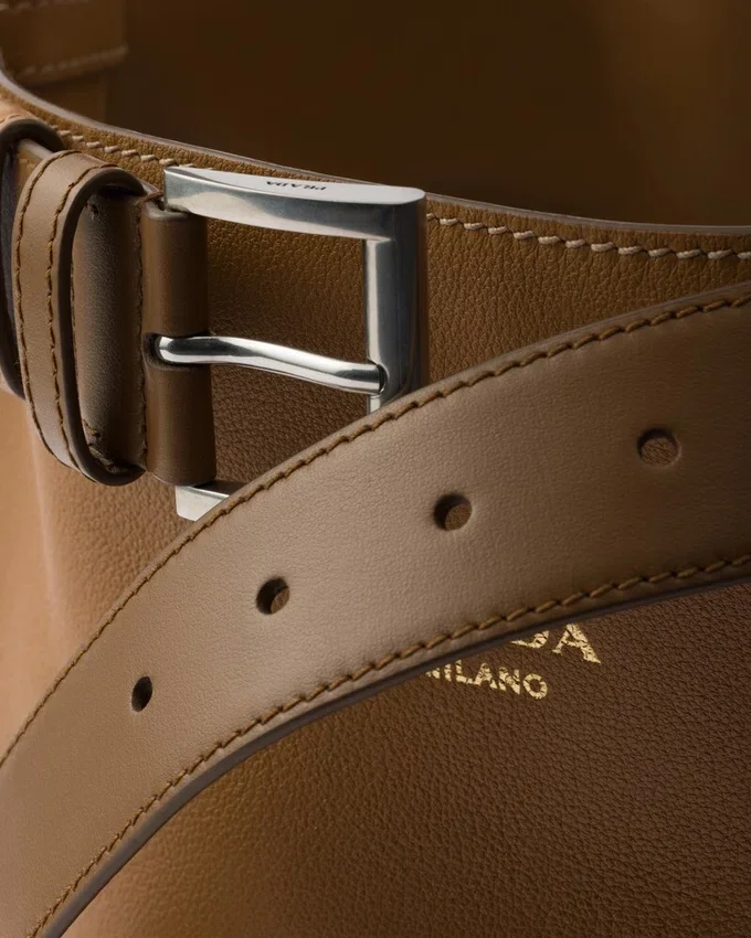 The Sophisticated and Modern Essence of the Prada Buckle Bag is Rediscovered in a New Bucket Silhouette with a Sleek Shape. The Belt with Iconic Buckle Enhances the Versatile and Contemporary Design.