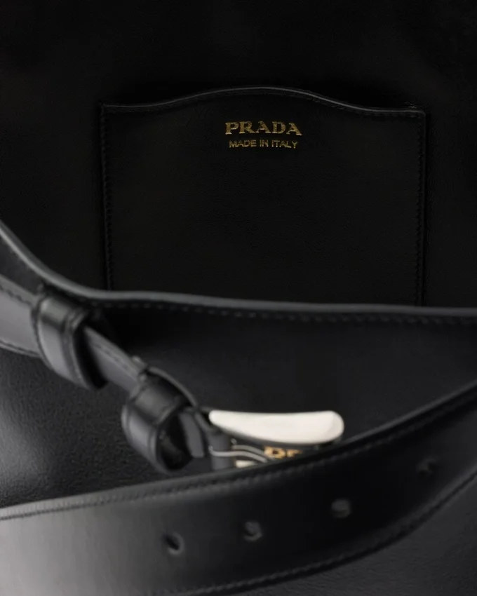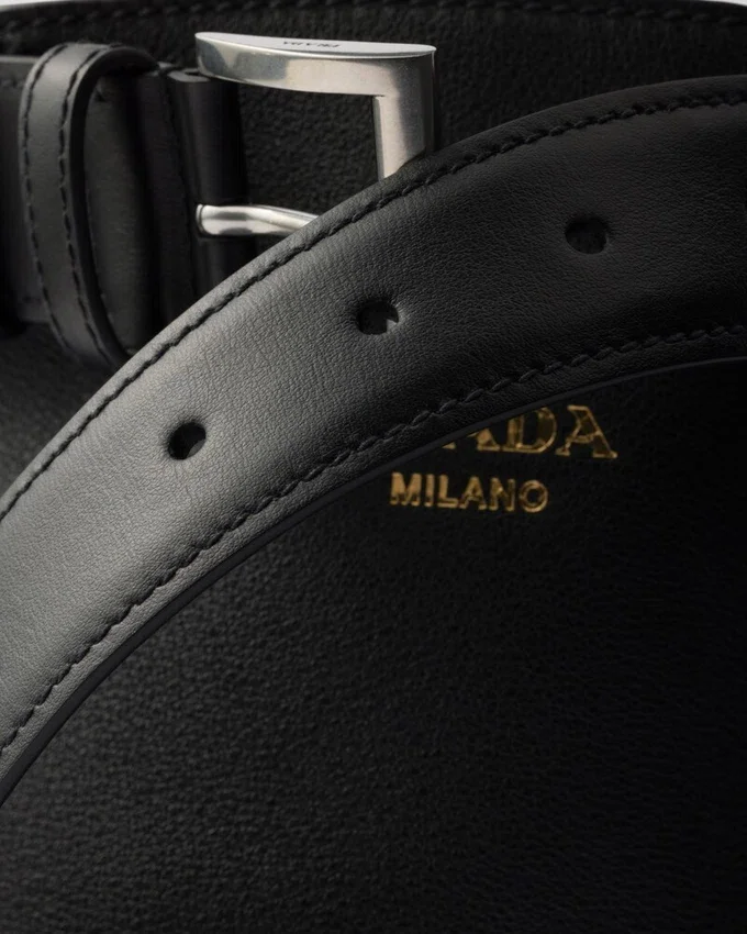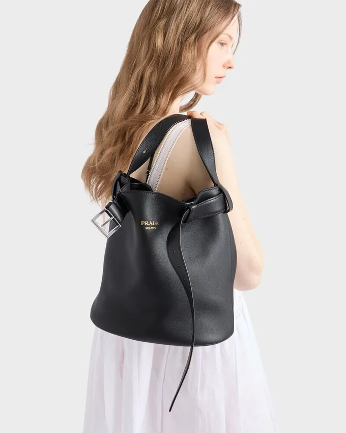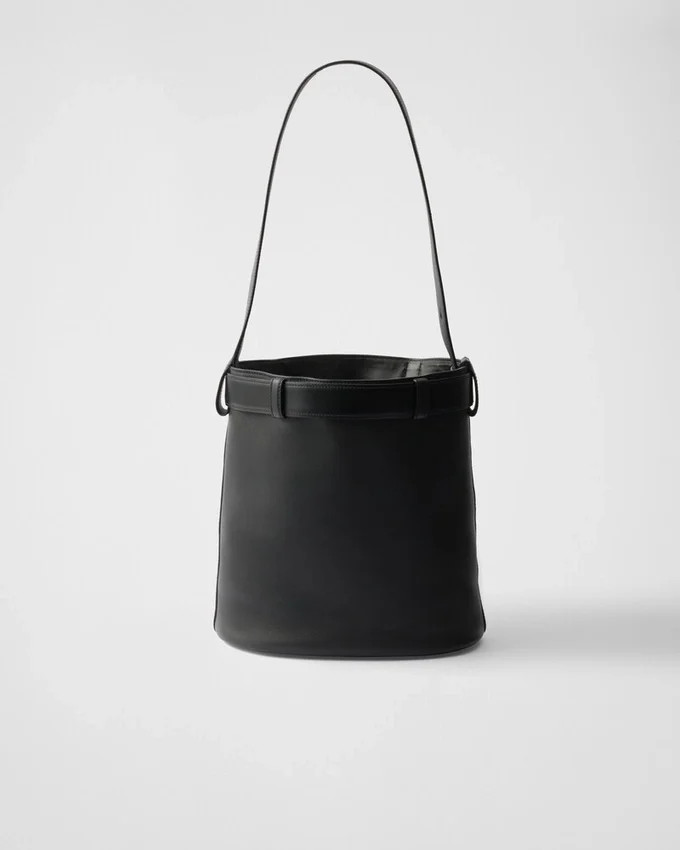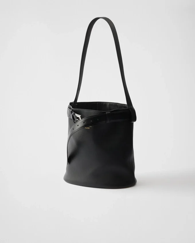 The Sophisticated and Modern Essence of the Prada Buckle Bag is Rediscovered in a New Bucket Silhouette with a Sleek Shape. The Belt with Iconic Buckle Enhances the Versatile and Contemporary Design.