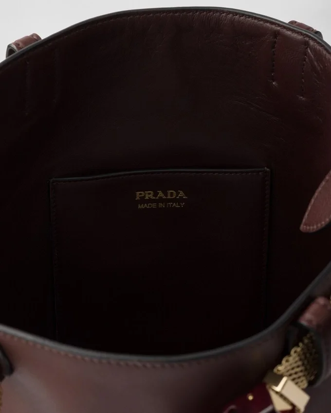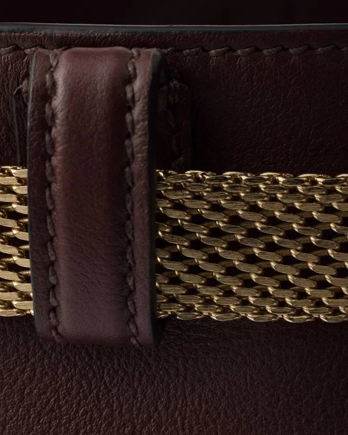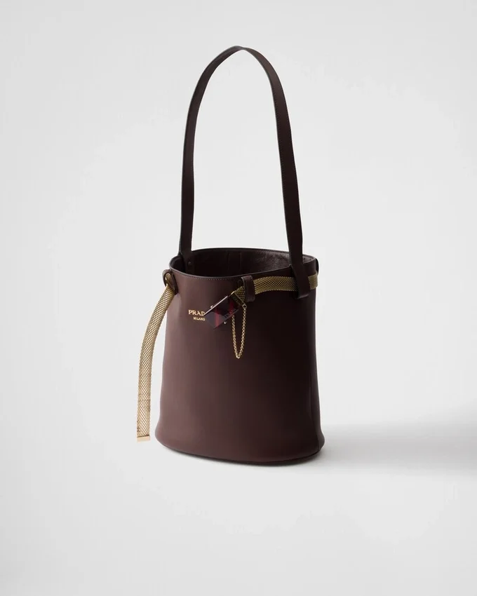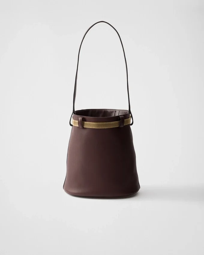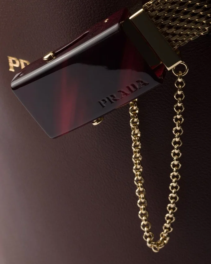 The Eclectic and Sophisticated Essence of the Prada Buckle Bag is Rediscovered in a New Bucket Silhouette with a Sleek Shape. The Jeweled Belt Made of Metallic Mesh with a Tortoiseshell-Finished Plaque Buckle, Completes the Soft Design with a Touch of Contemporary Elegance.