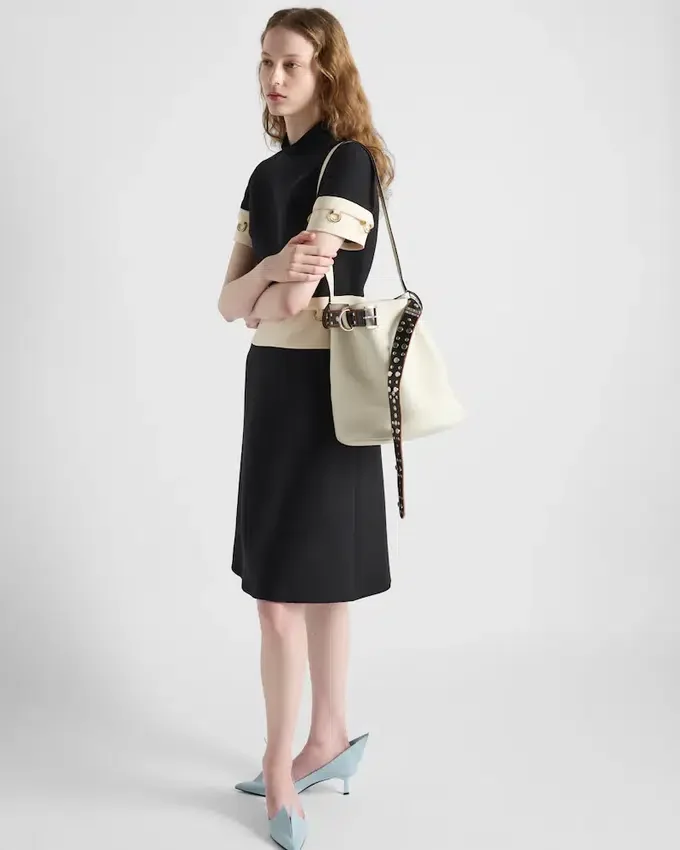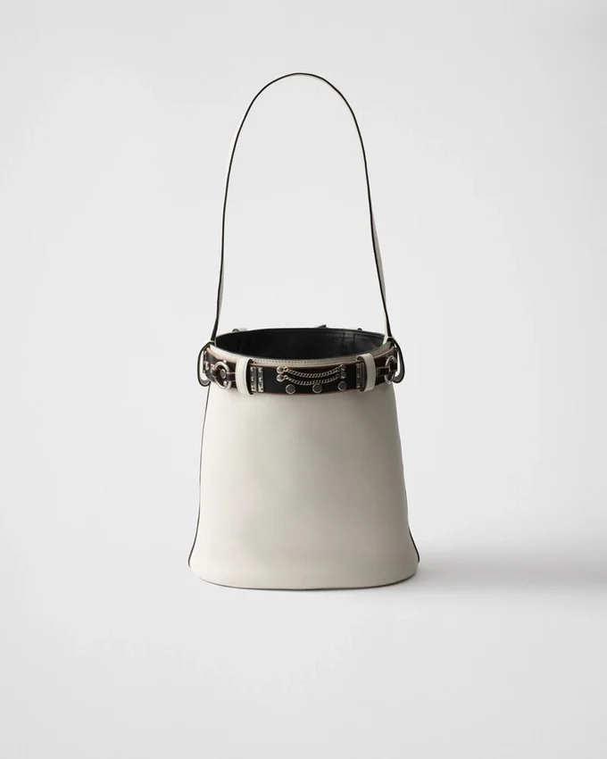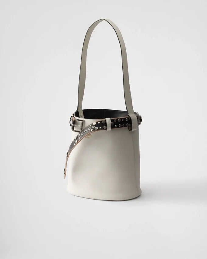 The Eclectic and Modern Essence of the Prada Buckle Bag is Rediscovered in a New Bucket Silhouette with a Sleek Shape. Bold Contrasts Brighten the Soft Design, Embellished with a Studded Belt with a Punk Aesthetic That Adds an Unexpected, Contemporary Touch.